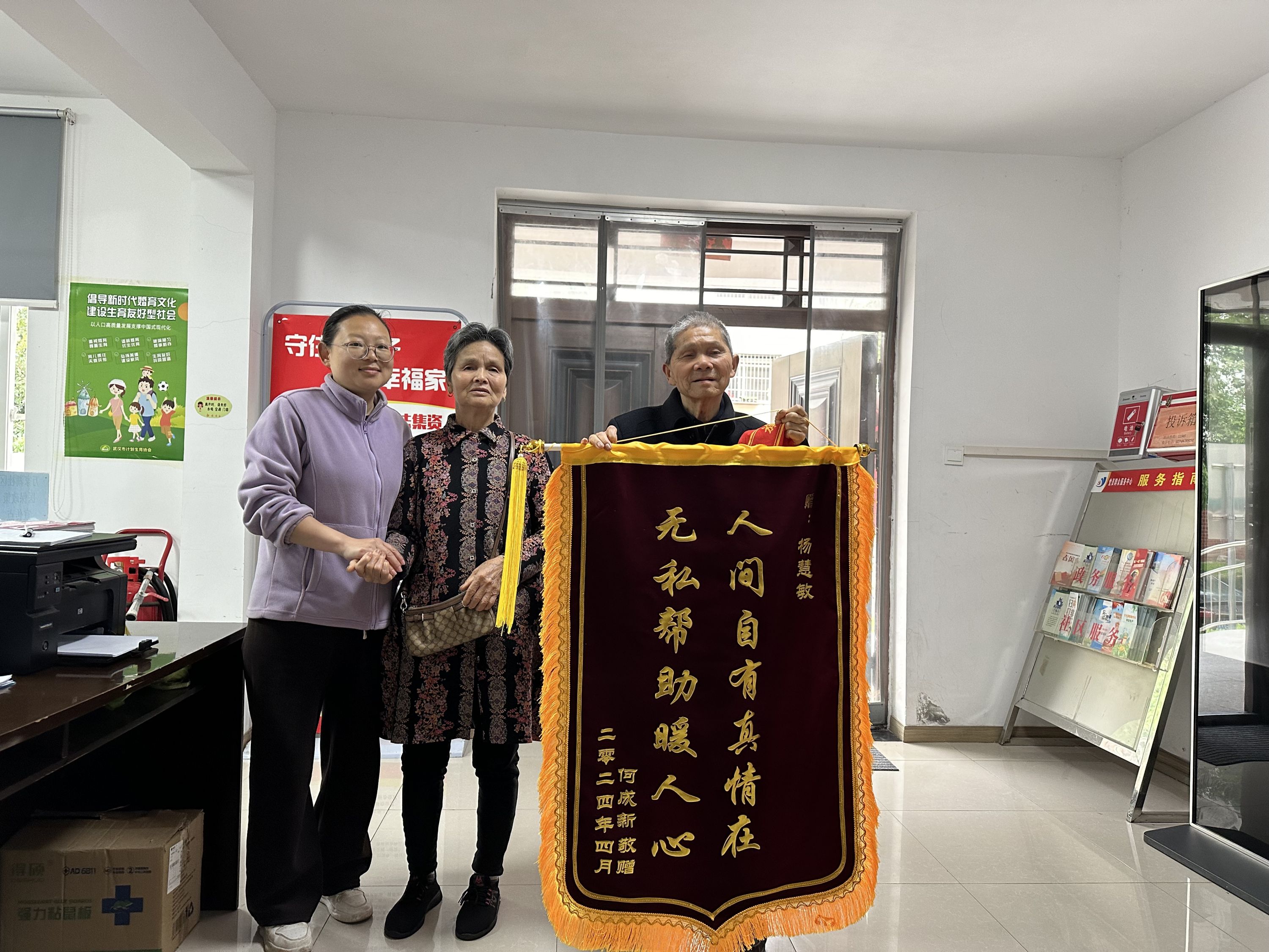 车谷融媒4月11日讯 “小杨,真是多亏了你!如果不是你,我儿子那天真的就危险哟!谢谢,谢谢……”4月8日,家住沌口街道万家湖社区的何爹爹和老伴将印有“人间自有真情在 无私帮助暖人心”的锦旗送到社区工作人员杨慧敏手中,连声感谢道。