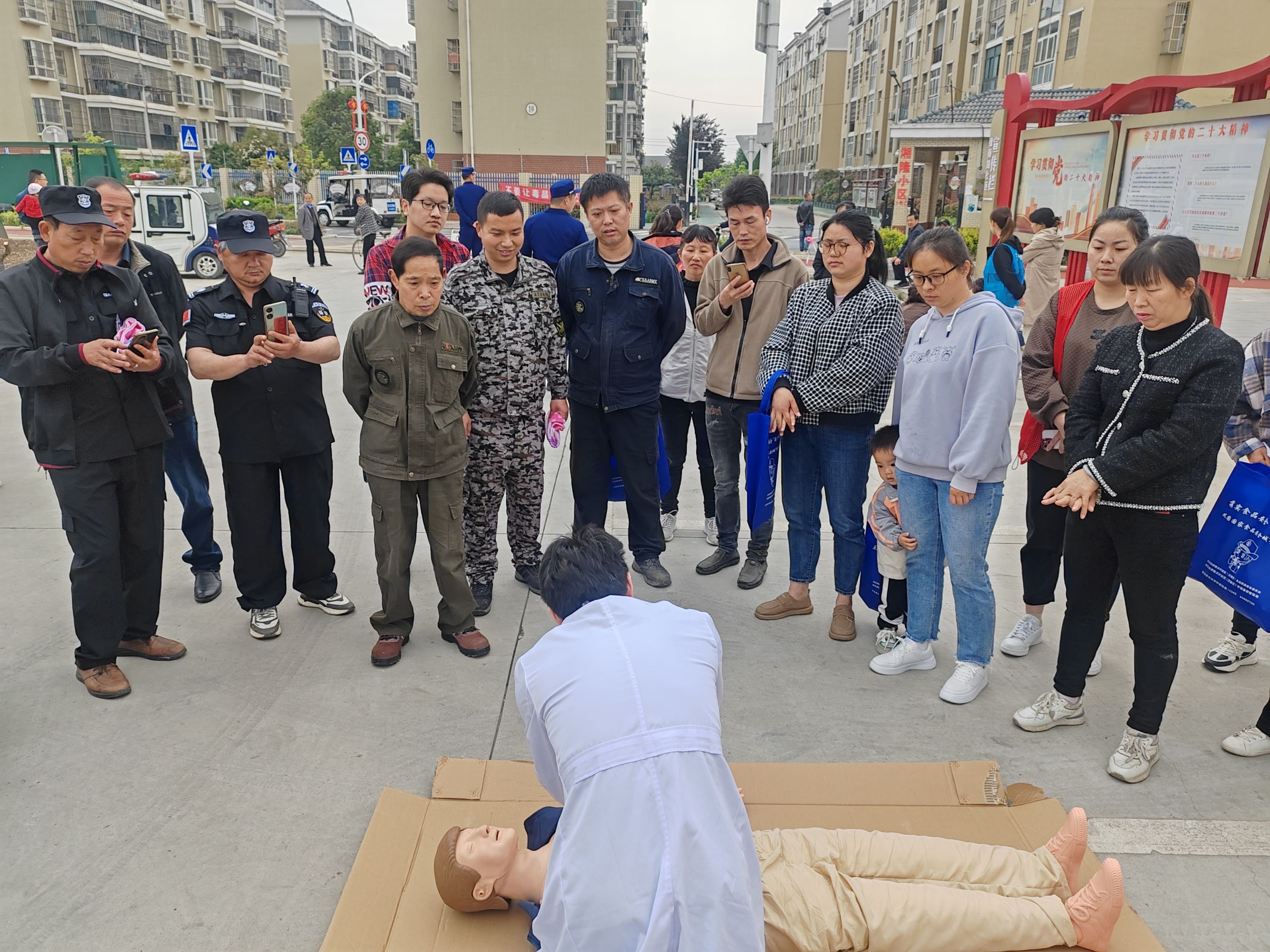 此外,在小区空地上,汉南消防救援大队联合街专职消防队就灭火器的性能、用途、使用方法、设备维护等基本知识和如何正确使用消防栓、铺设水带进行了展示。社区居民在消防救援人员的指导下成功用灭火器扑灭了火源,消除了安全隐患。“遇到呼吸、心搏骤停的人员,在黄金4分钟的时间内,对其实施高质量的心肺复苏将极大提高救治的概率。”湘口卫生院的工作人员对居民现场开展急救知识讲解,并重点演示了心肺复苏、现场救护、伤口包扎等救护技能,进一步提升了辖区居民应对突发事件的处置能力。