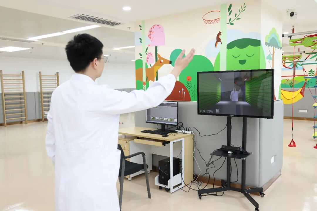 “康复治疗大厅分为运动治疗区、作业治疗区和感觉统合治疗区。”康复医学科治疗师杨光显说,儿童运动功能障碍主要源于运动与姿势控制的异常,康复治疗师会运用手法、器械,结合环境和多感官刺激,训练患儿的抓握、爬行、站立、行走等肢体运动功能,“比如这套Seeme情景互动治疗系统,将康复治疗的任务与目标以游戏的形式展现出来,激发患儿快乐情绪,使之积极主动参与训练,达到更好的治疗效果。”