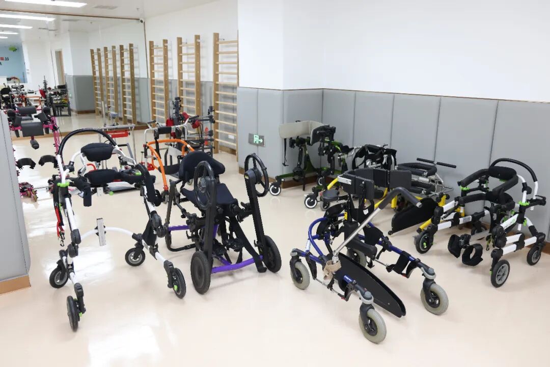 “儿童不同于成人,还处在生长发育期,所需设备更复杂,需要专门定制。”在治疗师工作站旁,记者发现了一批形似“轮椅”的设备,西院区康复医学科负责人毕博介绍,这些不同规格、型号的助行器、站立架可满足不同病种、不同年龄段孩子的康复治疗需求,“这些设备配备了防摔、防撞护具,安装了自适应全方向脚轮,高度、间距、姿态都可调节,不仅能保障儿童的安全,也增强了康复治疗的灵活性和便利性。”