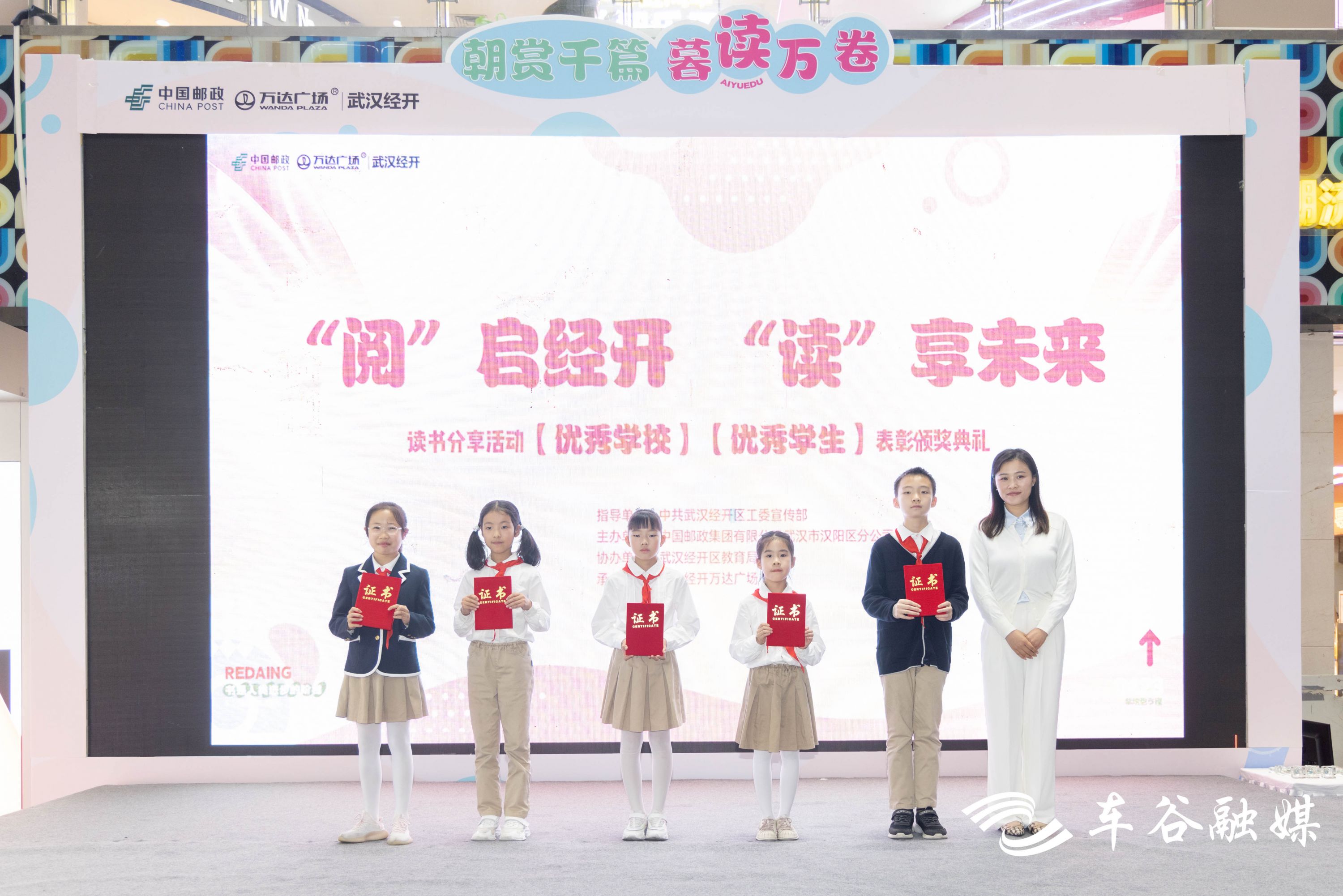 活动现场,2023年“‘阅’启经开‘读’享未来”图书巡展活动中的优秀示范学校和优秀学生代表现场被授予荣誉奖章,优秀学生代表上台分享阅读体会。