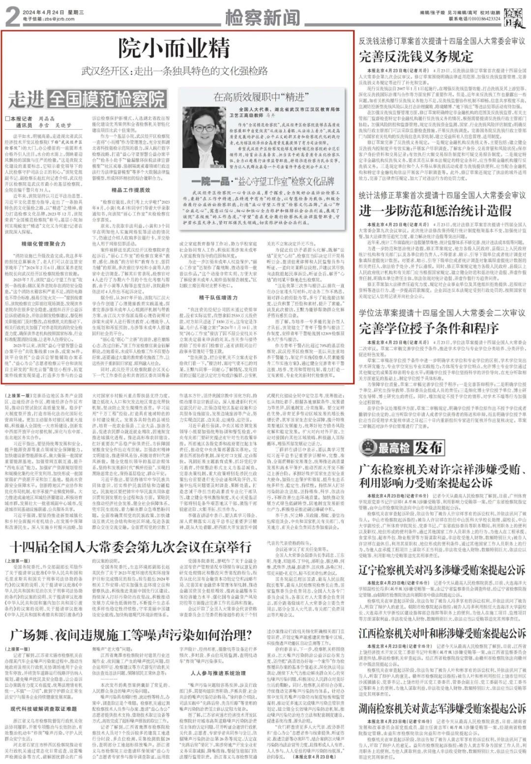 4月24日,《检察日报》第2版“检察新闻”刊发专题报道《院小而业精 武汉经开区:走出一条独具特色的文化强检路》,聚焦武汉经开区检察院坚持文化强检、文化润检,着力加强新时代检察文化建设的生动实践,展现出武汉经开区检察院以“精进”之精神,为大局服务、为人民司法、为法治担当的实绩实效。报道如下: