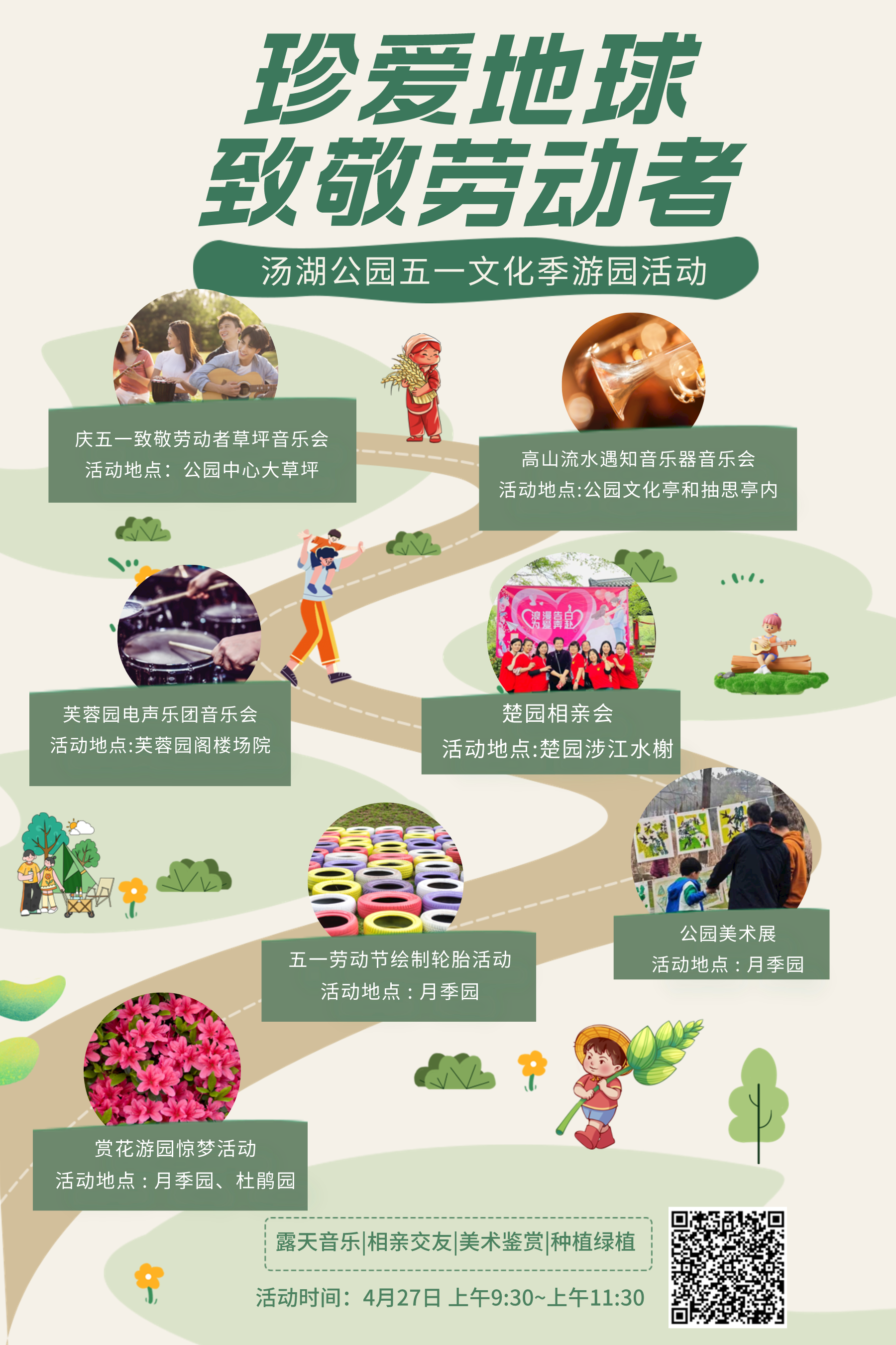 汤湖公园五一文化季游园活动,是武汉经开区文旅局倾力打造的“车谷文化艺术节”特色品牌系列活动之一,通过丰富多彩的草坪音乐会、美术鉴赏、相亲交友会、赏花游园等形式,积极创造人与自然和谐共生,共享绿色生态美景,共造美好幸福家园。