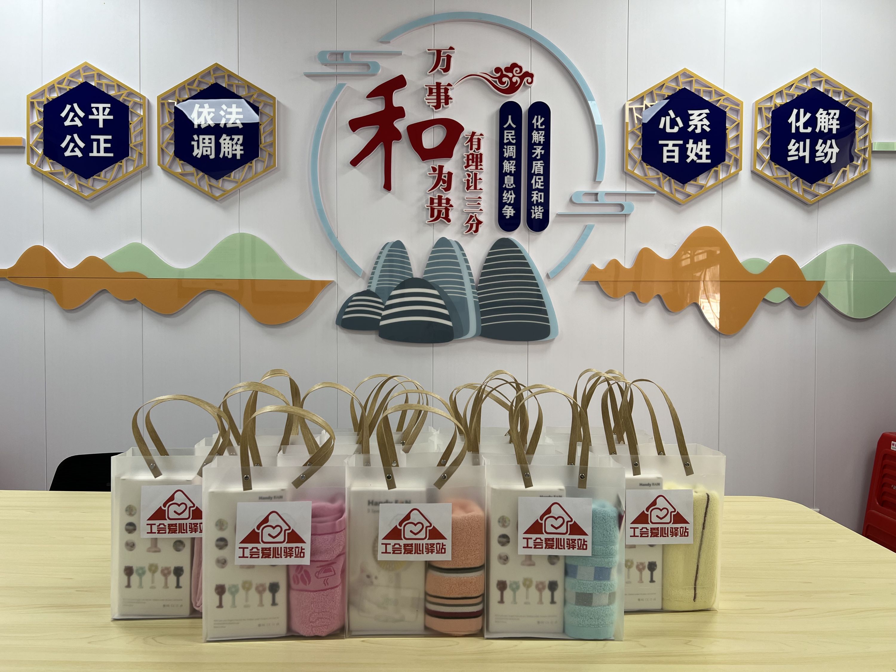 活动现场,工作人员把一份份装有小风扇、毛巾等物品的“爱心礼包”,送给前来爱心驿站休息的户外劳动者们,希望他们感受到节日的喜悦和工会“娘家人”的浓浓关爱。