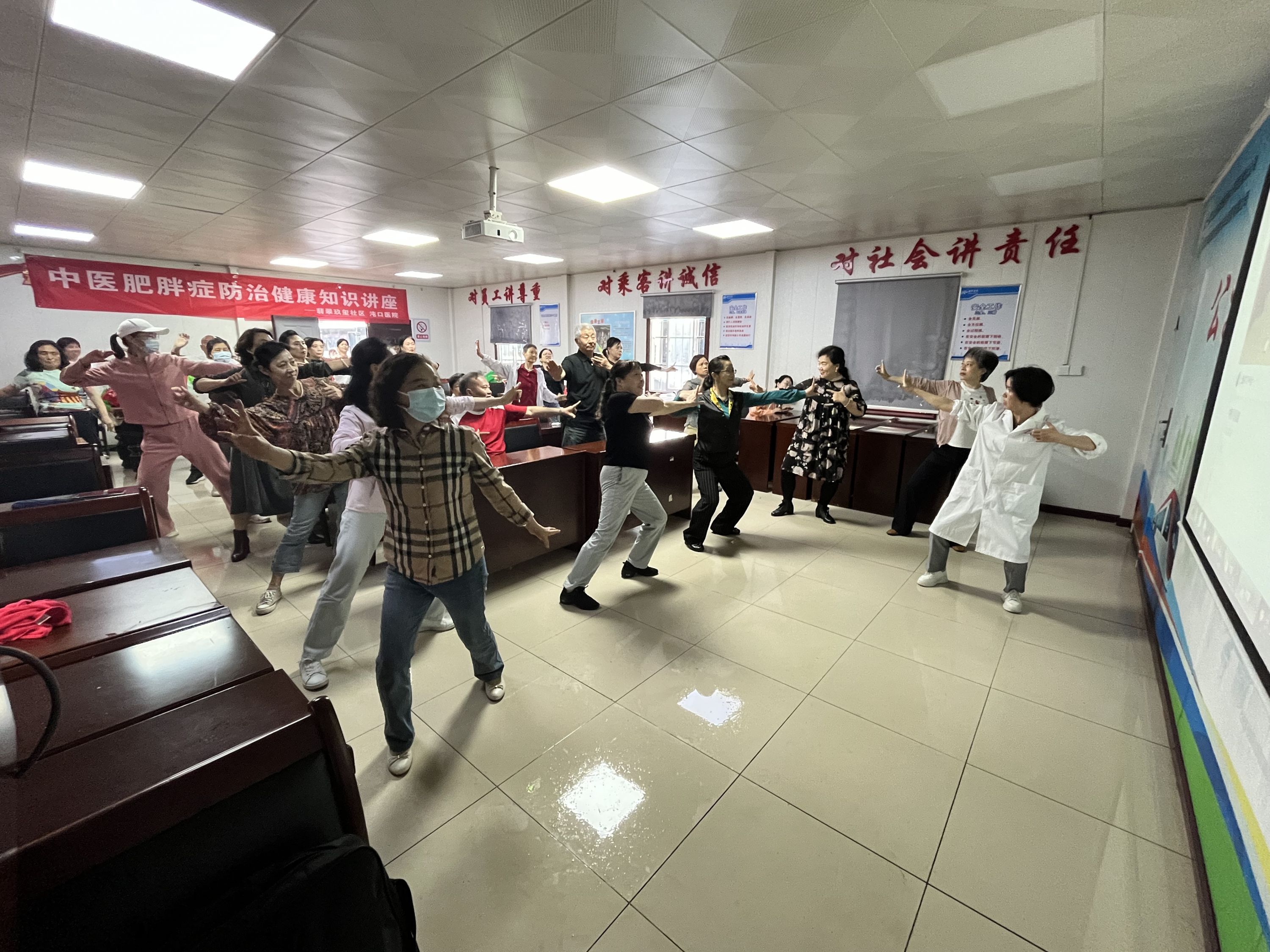 健康知识讲解过程中,沌口医院徐医生深入浅出地为老年朋友们科普了常见的中医药知识,引导他们树立正确中医养生理念。同时,徐医生又形象生动地为大家讲解并展示了八段锦的作用和练习方法,手把手示范、纠正老年朋友的姿势和动作,并带着他们一起熟悉全套动作。