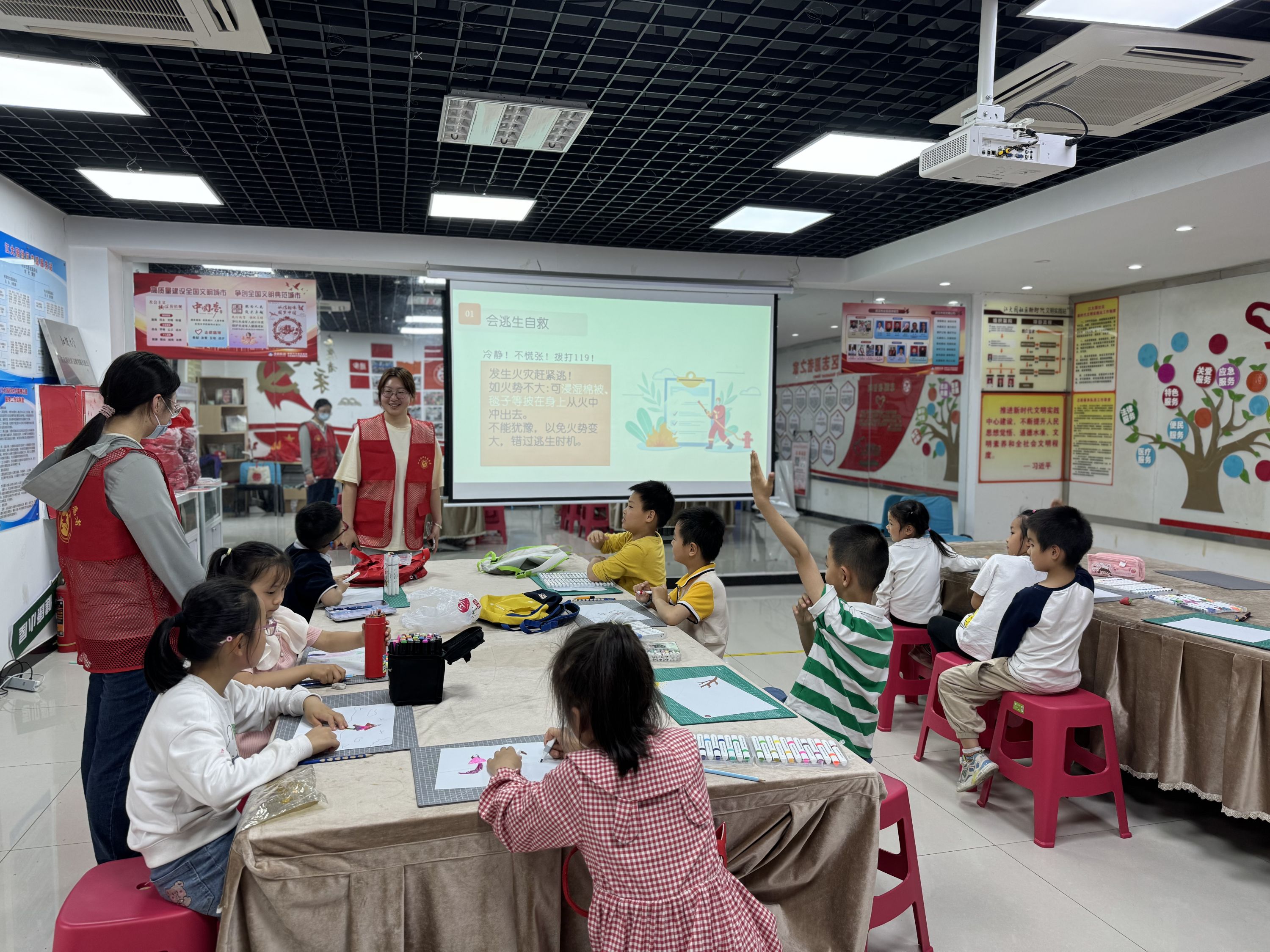课堂上,江汉大学设计学院的志愿者们向孩子们传授了消防安全知识,包括火灾的危害性、预防措施以及火灾中的正确逃生方法等关键内容。孩子们聚精会神地听讲,积极互动,不断提出各种问题,志愿者耐心细致地一一解答,现场气氛热烈。随后,孩子们开始了他们的绘画创作之旅。他们或用彩笔勾勒消防员英勇救火的场景,或用颜料描绘火灾现场紧急疏散的情景。一幅幅作品既展现了孩子们丰富的想象力和创造力,又传递了消防安全的重要信息。