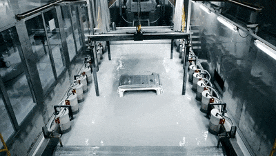 焊装车间共有62台机器臂手,具备100%焊接自动化、双主拼设计和不限车型数量的柔性生产能力。先进的工艺水平,带来精度、强度、轻量化方面的大幅提升:行业首次应用的内高压纵梁在车架总成焊接线上得以应用,通过内高压成型技术减少焊缝长度约18米,车架总成重量优化27公斤;国内首创的铝外板钢内板滚边工艺可实现车身减重12.6公斤;在铝板烘烤变形的精度控制上采用独有技术标准,可确保变形量控制在1.5毫米以内。