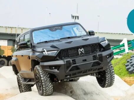 一辆黑色的猛士科技917爬上近乎45度的小山丘,又俯冲至水道,激起水花,穿过坑坑洼洼的石子路,一路前行。