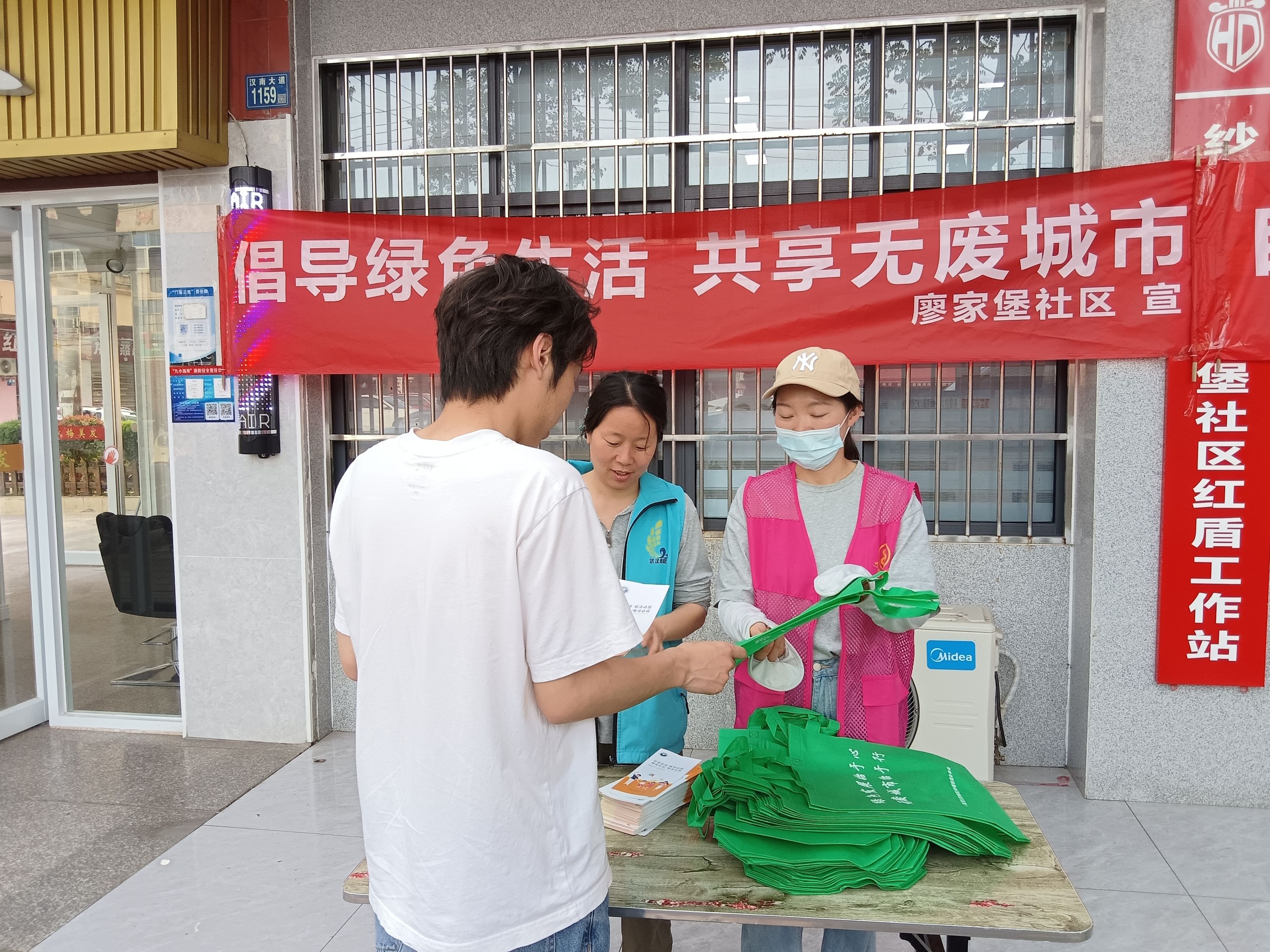 车谷融媒5月9日讯 5月8日下午,纱帽街道廖家堡社区组织工作人员、党员、志愿者,在红盾工作站开展“倡导绿色生活共享无废城市”宣传活动。