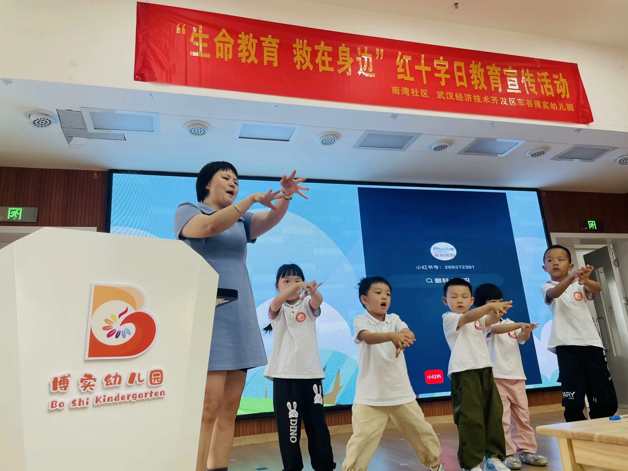 车谷融媒5月9日讯 5月8日,武汉经开区沌阳街道南湾社区携手辖区内的博实幼儿园,共同开展“生命教育 救在身边”红十字日教育宣传活动,进一步提高青少年对急救知识的认识,培养自救互救能力,营造“人人学急救,人人会急救”的社区氛围。