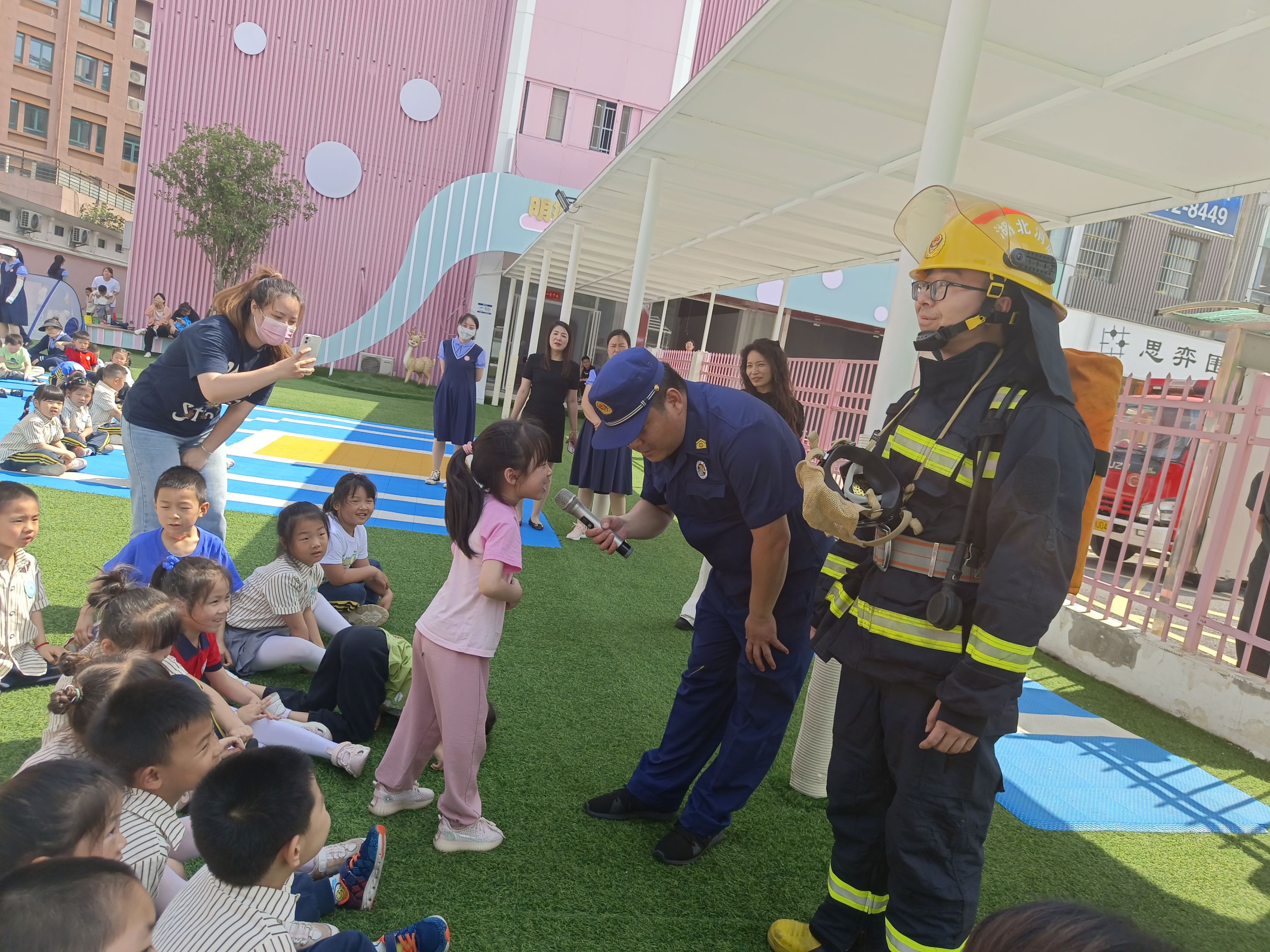 全体人员安全撤离后,工作人员仿造“着火点”,由小朋友模拟报警,接到报警电话后,消防员以最快的速度到达了着火点,为孩子们带来一场“沉浸式”的消防体验,并向全体教职工普及消防知识。