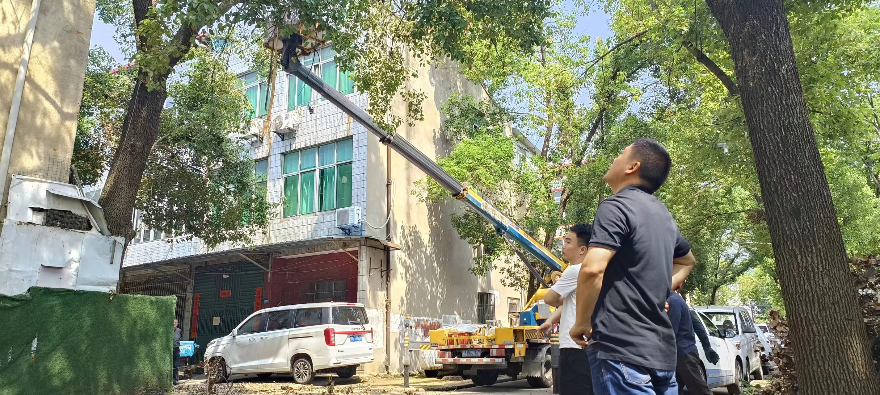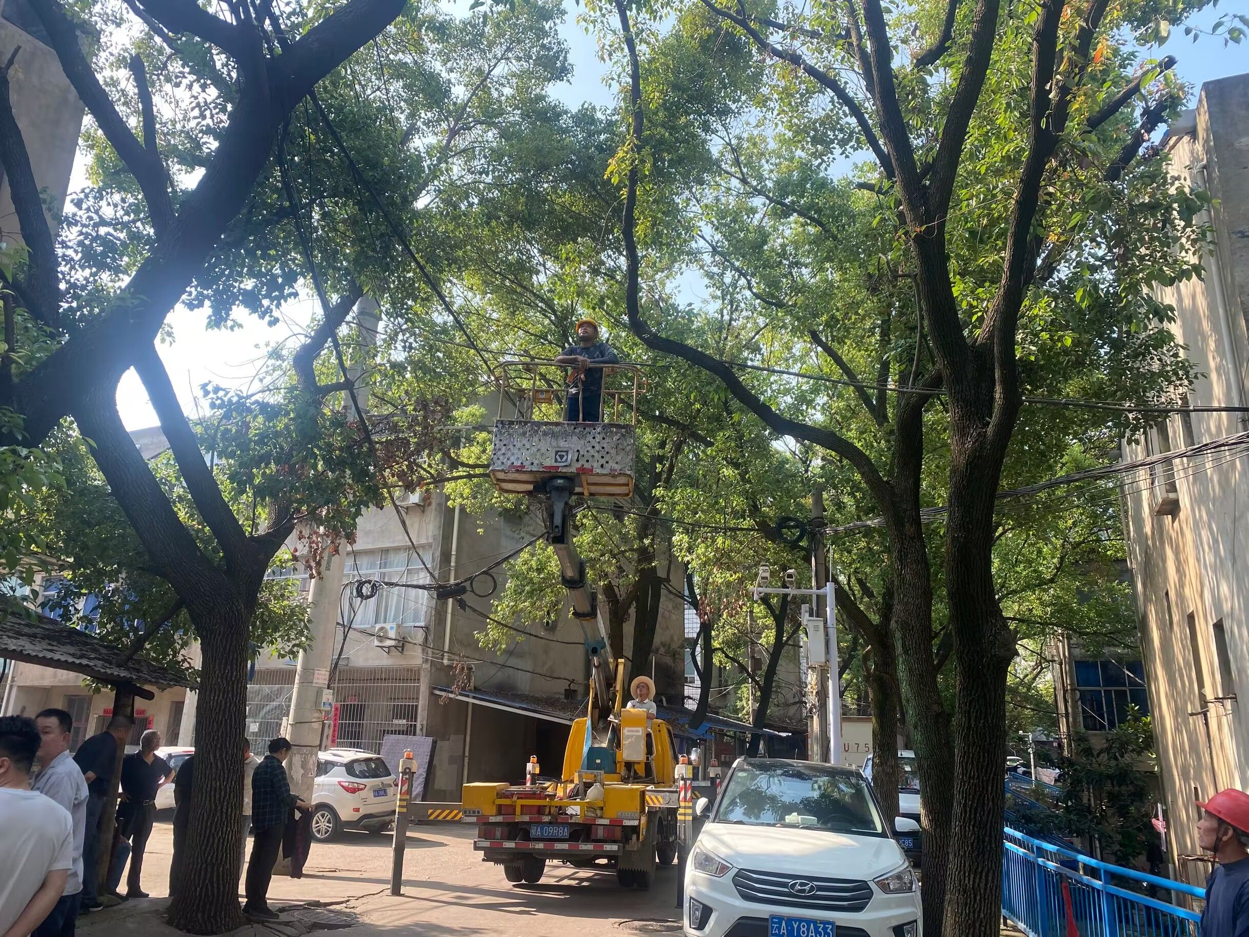在修剪过程中,社区工作人员通知树木附近停放车辆的车主移车,并在树木周围拉起警戒线。由于树木过高,树枝杂乱无章,部分树枝与高压线相互交错,修剪难度较大,为不损伤电线,只能在吊车的配合下,依靠施工人员用手锯慢慢修剪。