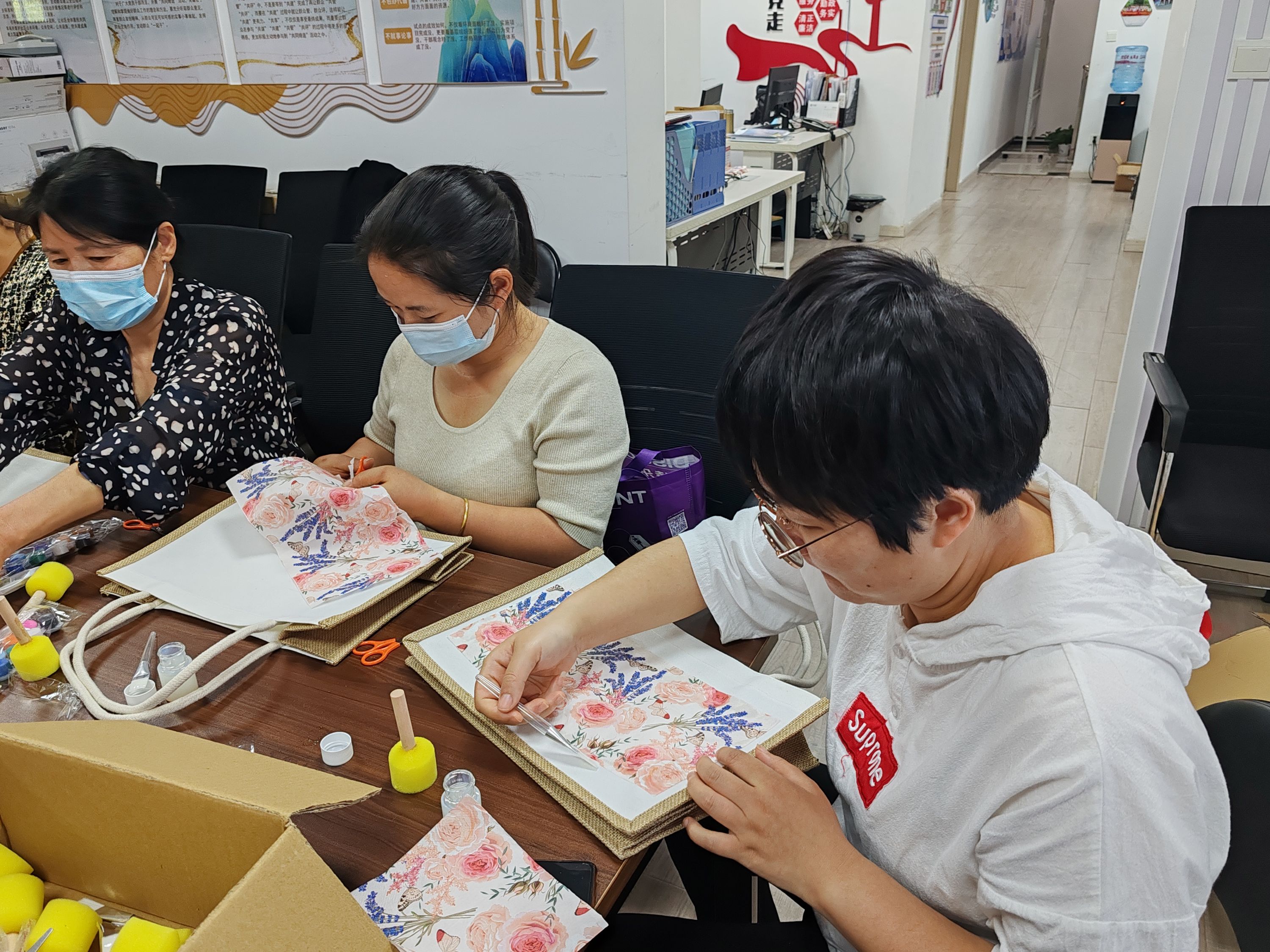 在手工制作环节,妈妈们兴致勃勃地挑选自己喜欢的图案,开始精心绘制。剪裁、拼接、粘贴、刷胶、贴画、用海绵按压融合……每一步的操作,她们都细致认真,力求完美,添加了自己的创意,使平凡无奇的棉麻布包被赋予了新的生命力,变得独具美感。
