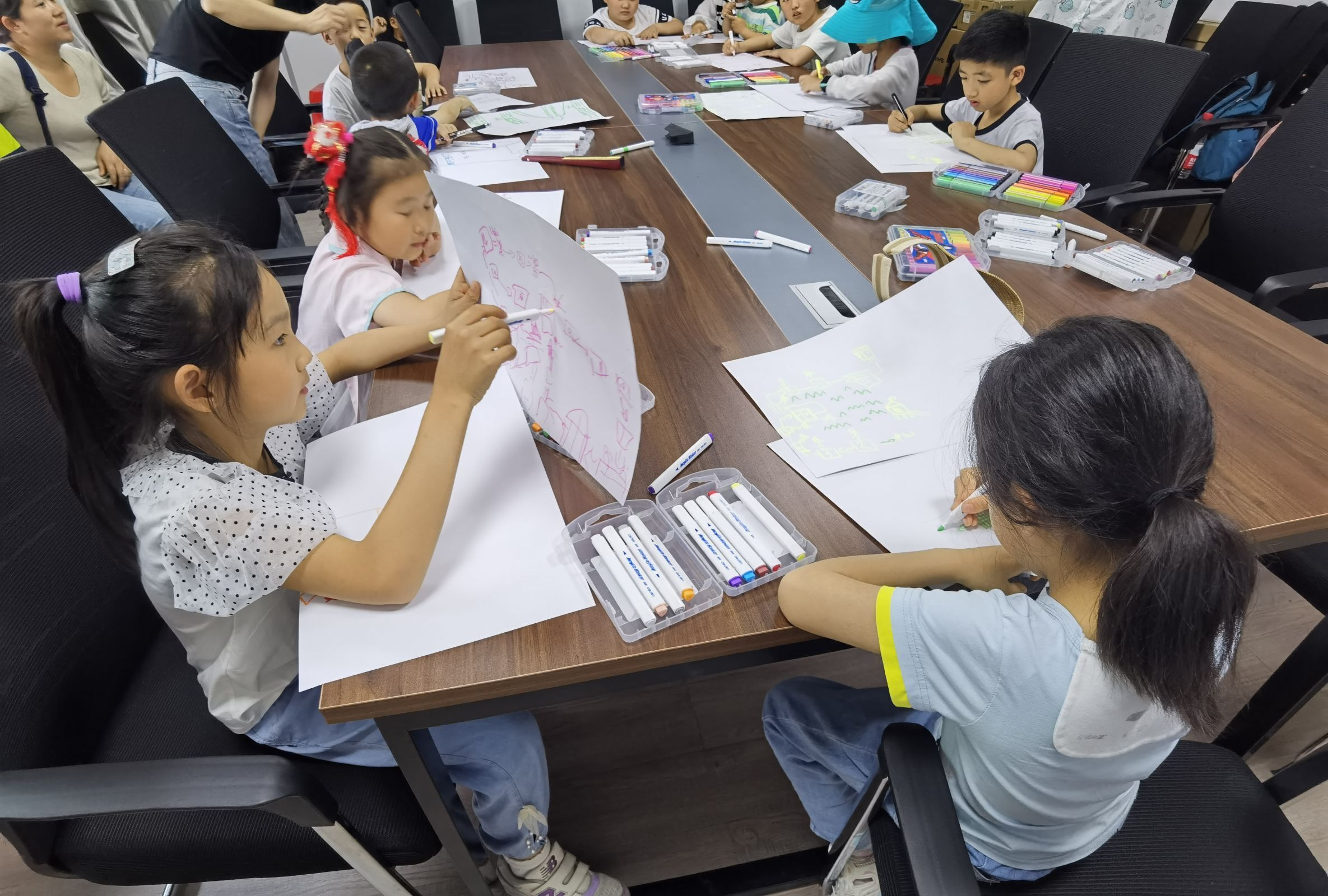 踩点活动告一段落,孩子们带着满满的收获回到社区的党群服务中心。在社工老师的指导下,“小小志愿墩”将之前收集的点滴信息转化为一幅幅生动活泼的地图。在绘制的过程中,小朋友们相互协助,共同克服困难,一起绘制出一幅幅充满个性和温度的社区地图。一排排居民楼、停车棚、健身器材便跃然纸上。