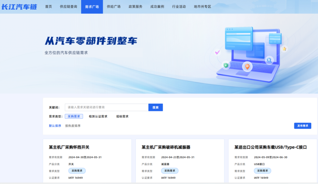 长江汽车链平台设有“需求广场”“供给广场”大板块,为企业提供全方位的供需对接服务。在需求广场,企业可以发布需求信息,平台通过智能匹配,帮助企业快速找到符合要求的供应商。同时,企业也可以在供给广场上发布供给信息,展示产品和服务,方便采购商进行搜索和匹配。这种高效的供需对接方式,有助于提高供应链协同效率,实现资源的高效配置与利用。