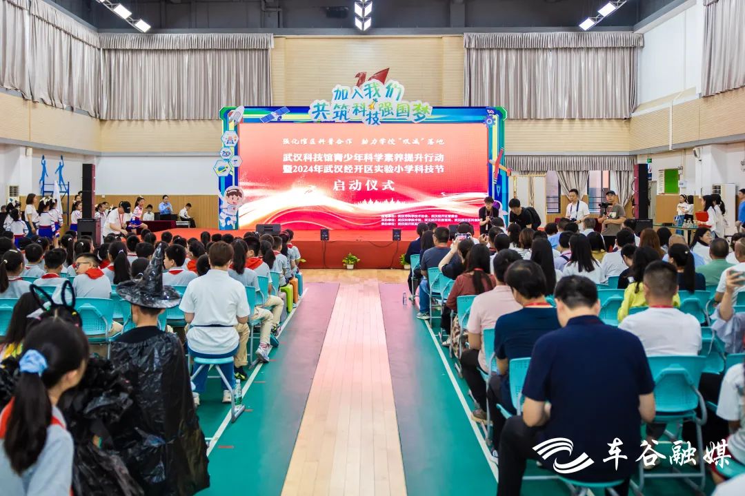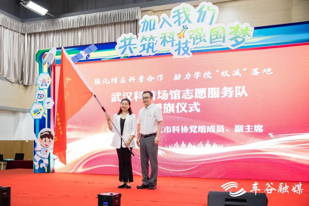 现场,市科协向武汉经开区实验小学授予武汉科普场馆志愿服务队队旗,武汉经开区实验小学学生代表宣读倡议书,由武汉科技馆精心编排、以武汉纺织大学徐卫林院士团队为原型的科普剧《月面中国红》当天首演。