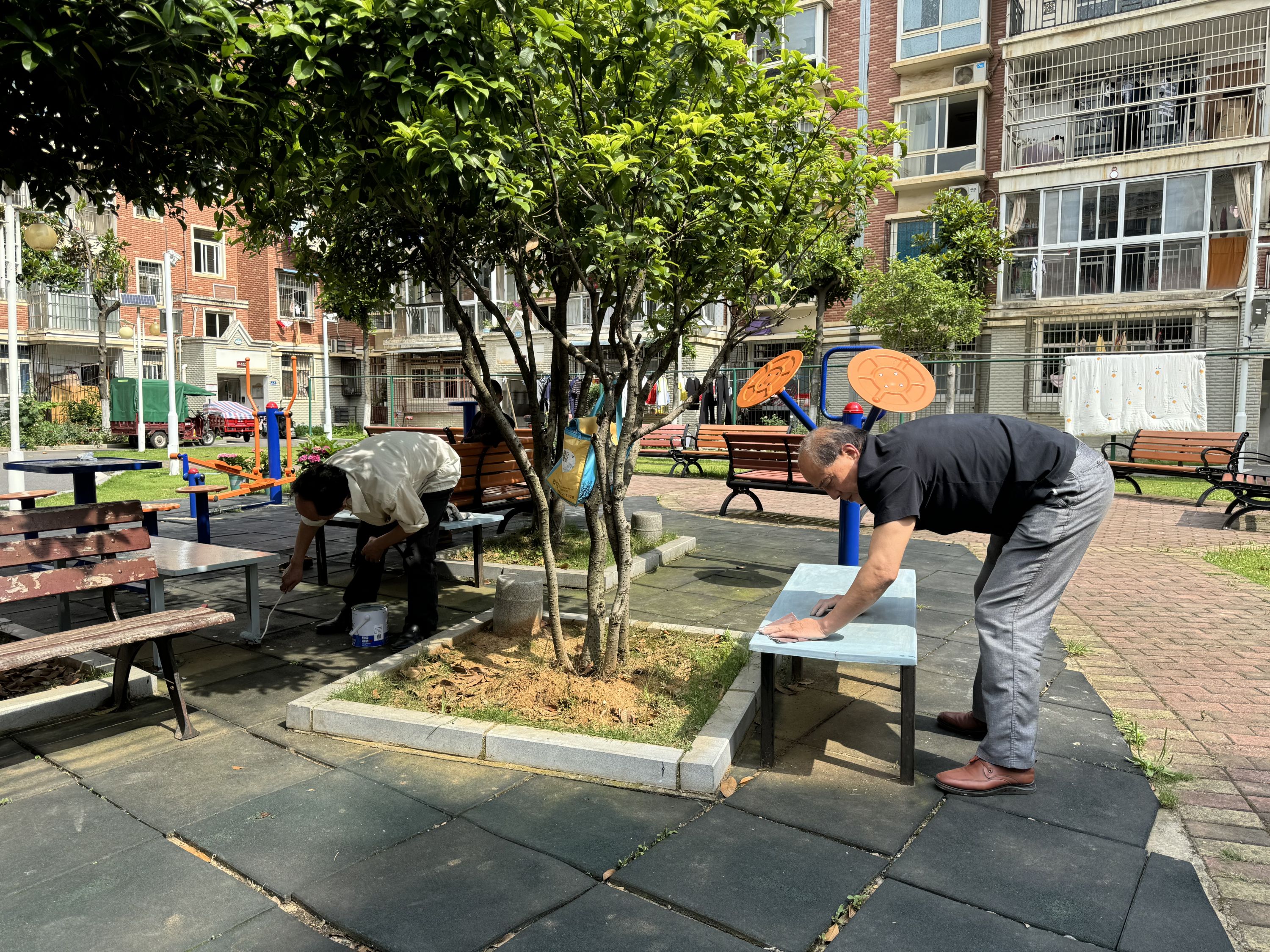 近期,居住在社区4栋的张传彦师傅看到楼栋下面的乘凉休闲椅掉漆生锈,于是他立刻抽出干活的时间,自掏腰包,带着工友拿着砂纸、刷子给楼下休闲座椅刷着油漆。座椅表面被精细打磨,一罐淡绿色的油漆,用毛刷蘸少许油漆后,自上而下,自左而右地刷了起来,最后再用毛刷轻轻地修饰椅子的边缘棱角,邻居们纷纷对这位“专业能人”点起了赞。