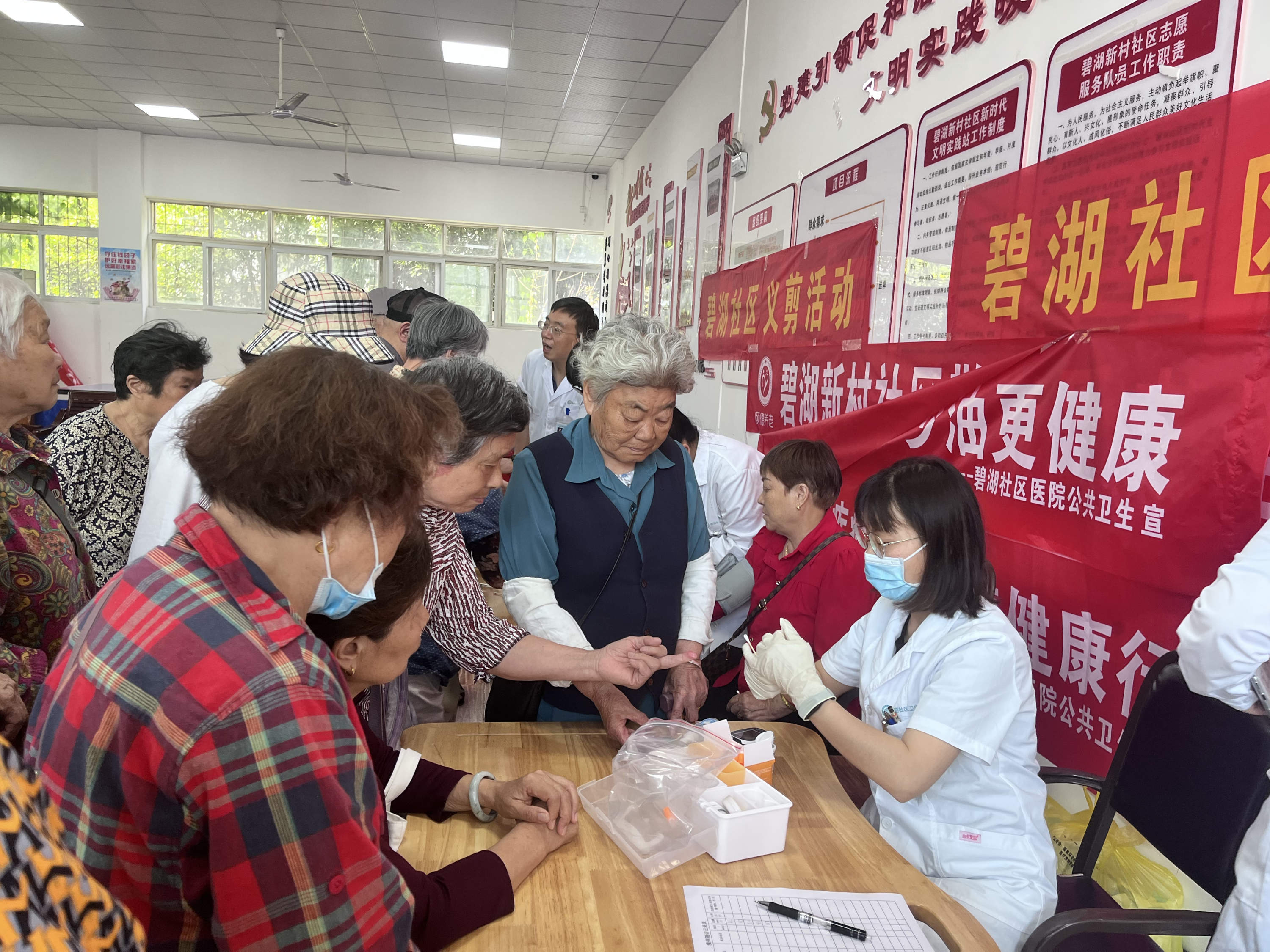 “辛爹爹,您的血压是正常的,但餐后两小时血糖偏高,注意日常控制饮食,饭后可以适当散散步。”“张阿姨,您的血压有点高,有没有按时吃药?有时间来卫生院做免费体检。”沌阳街道碧湖社区卫生院的医护人员耐心细致地为老人测量血压、血糖,检查身体,详细讲解普及高血脂、高血压等相关健康知识,开展免费咨询义诊服务。
