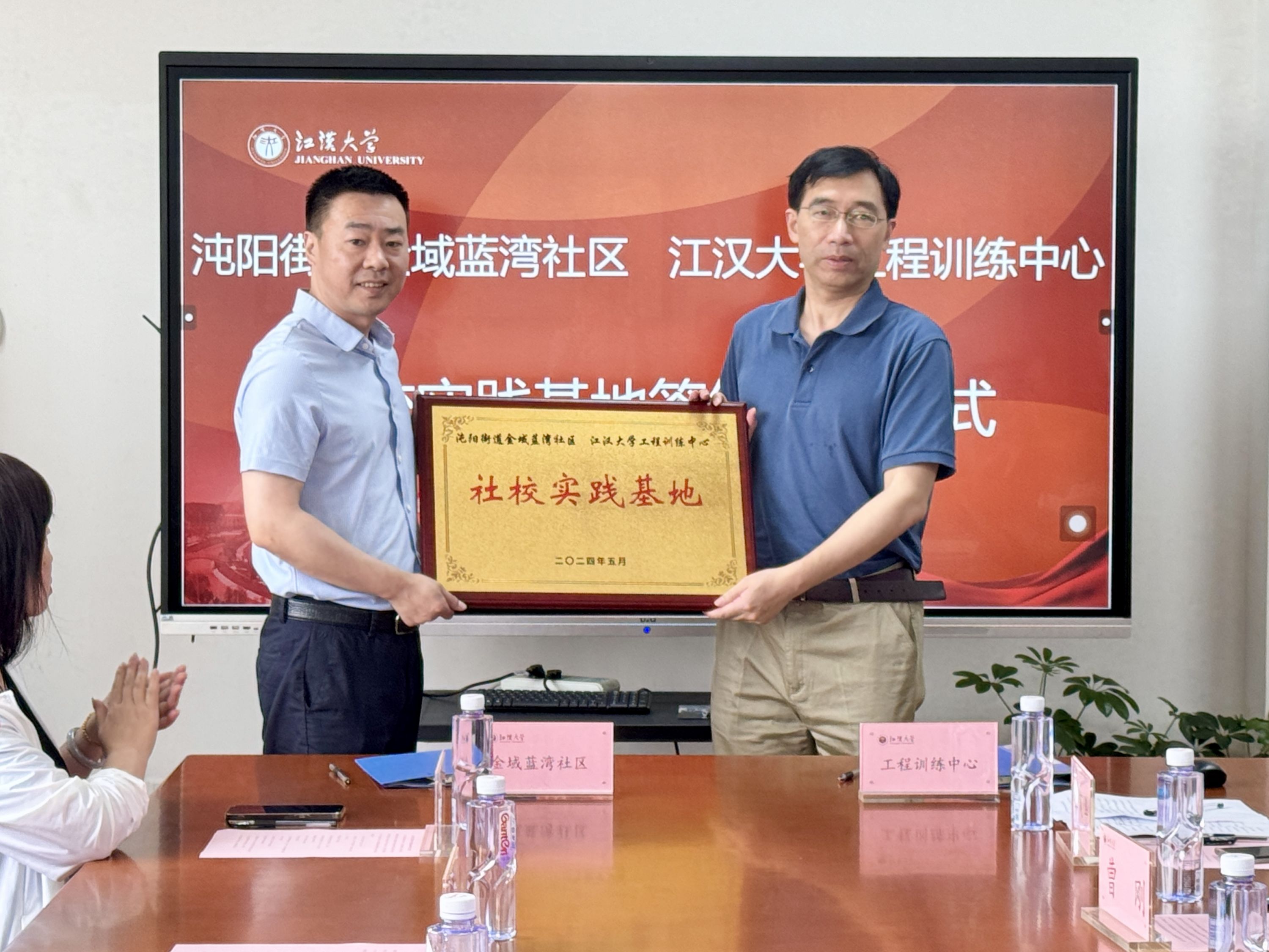 江汉大学教务处副处长、工训中心主任漆为民教授介绍中心情况,金域蓝湾社区书记邹帅介绍社区基本情况。双方签署社校实践基地协议,开展社校实践基地授牌仪式。社校双方将共同建设实践基地,共同致力于为青年提供一个实践和展示自我的平台,帮助青年积累宝贵的实践经验,激励他们为社会的繁荣和进步贡献智慧和力量。