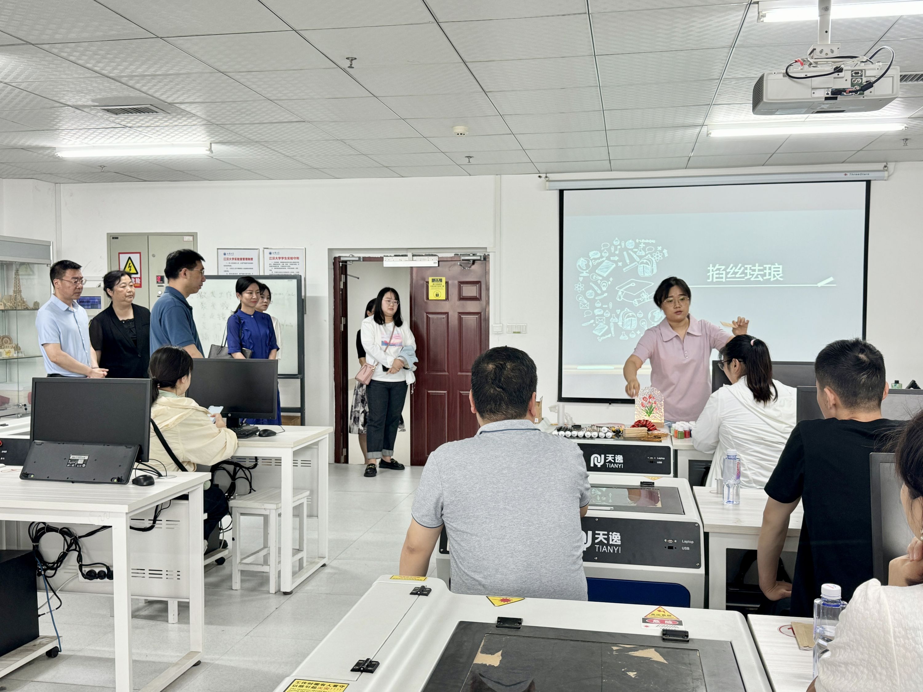 金域蓝湾社区青年干事和江汉大学工程训练中心教师代表前往工训中心激光雕刻实训室开展社校实践基地的首次实践活动:制作掐丝珐琅书签。实践将现代科技工艺与传统技艺相结合,通过激光雕刻、涂胶、掐丝、淘沙、填彩、封胶,金域蓝湾社区的LOGO“家”呈现出来,画面保持了金丝镶嵌,线条精细清晰,极具立体感。