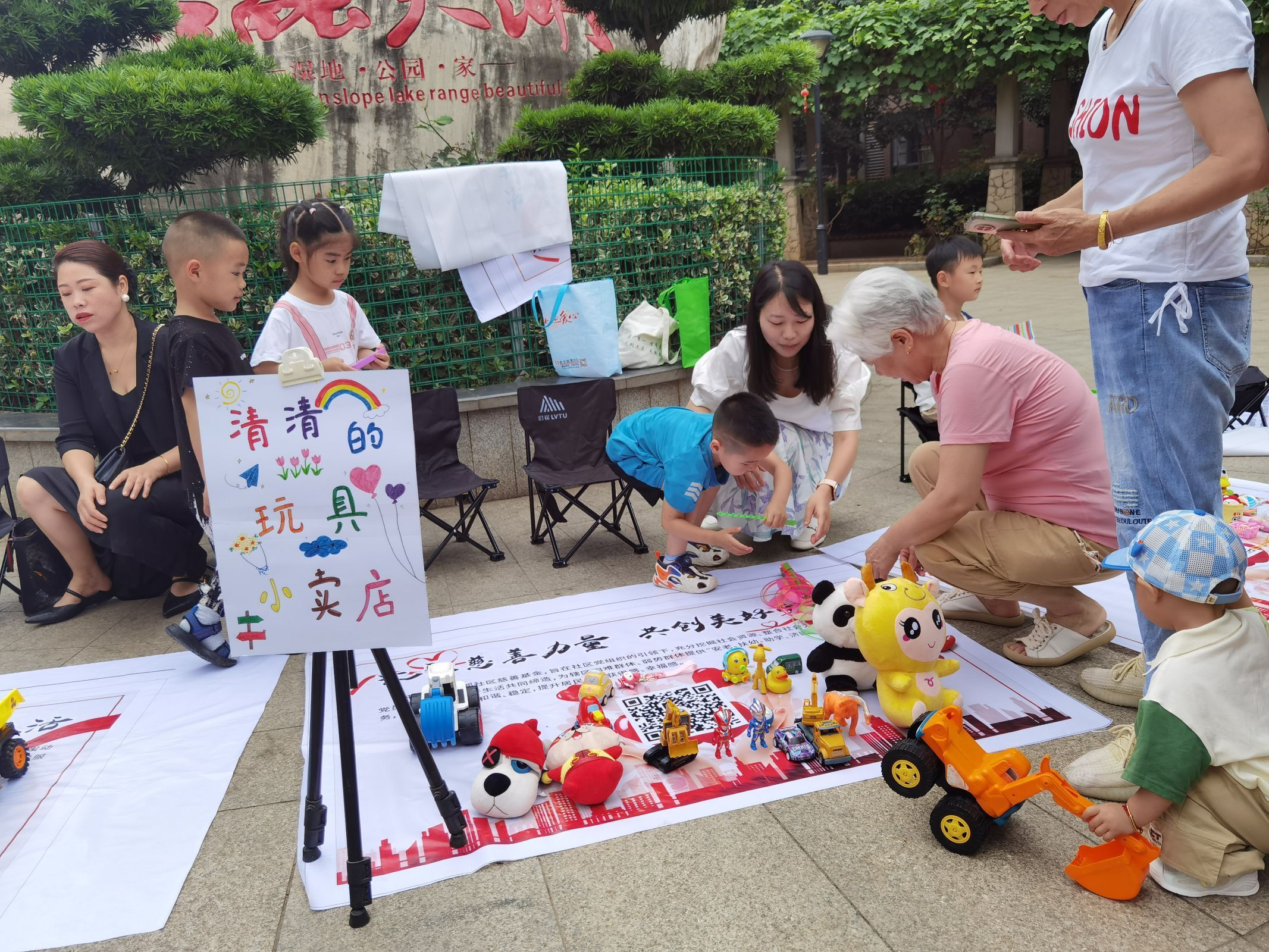 为广泛动员居民群众参与慈善事业,沌口街道新都社区联合君融天湖幼儿园的小朋友及其家庭参与慈善义卖活动,精心布置的摊位上,毛绒玩偶、小汽车、益智积木等玩具有序摆放。