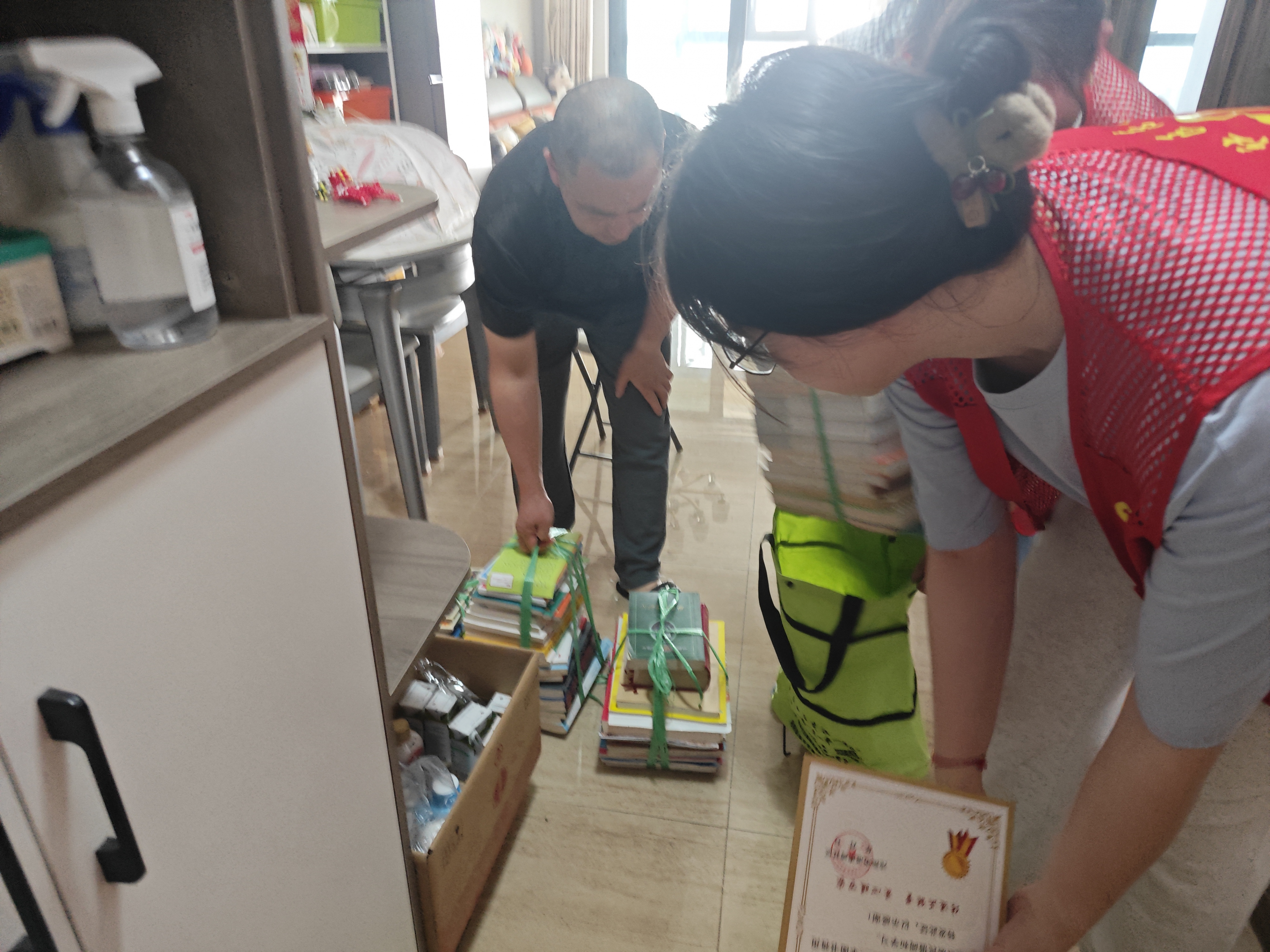 当天下午,社区工作人员带着便携小拖车来到居民家中,上门取书。“我看到社区号召捐赠图书的倡议书,今天一大早把要捐的书整理好。可惜书太多了,没办法拿到社区去,还好社区人员可以上门取书,真是方便多了。”捐书的童先生边向社区工作人员递交图书边说。