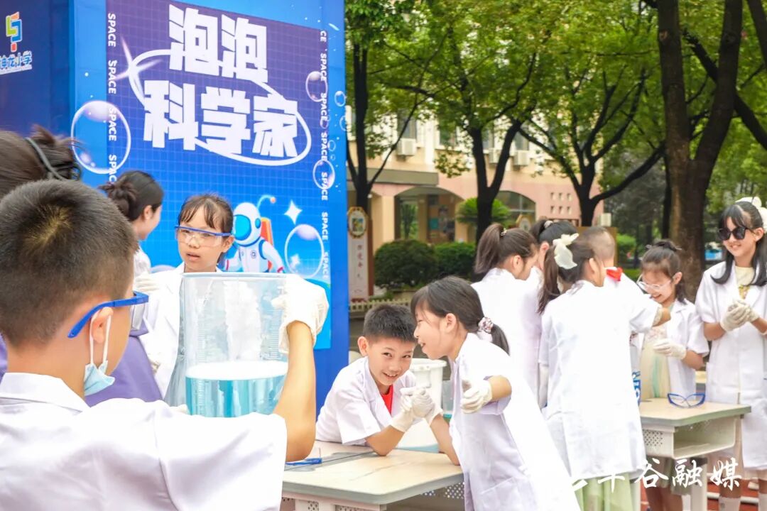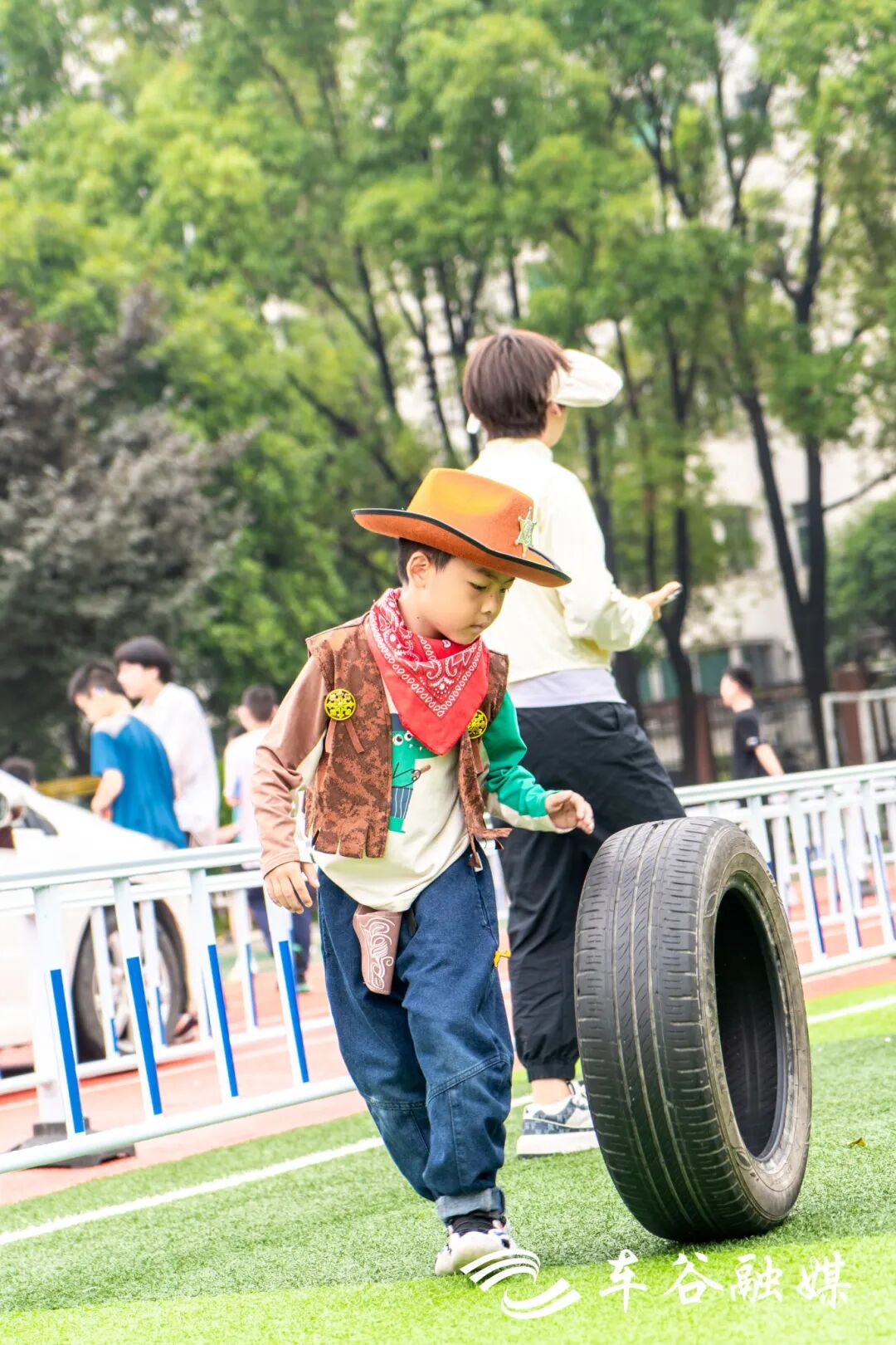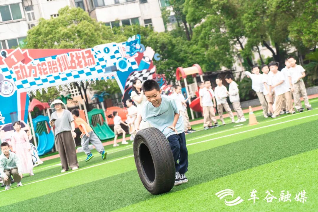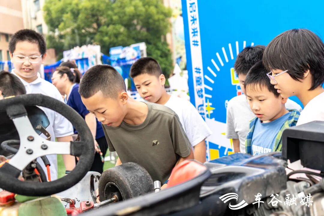 操场上,一、二年级的小朋友们进行轮胎接力赛;四年级学生身穿白色实验服,佩戴护目镜,调配制作洗车清洁液;五年级的同学们身穿修车工服,化身巧手装卸师,体验卡丁车装卸;六年级的学生们利用学弟学妹制作的洗车液给汽车做了个美容,孩子们在劳动中获得了满满的成就感。
