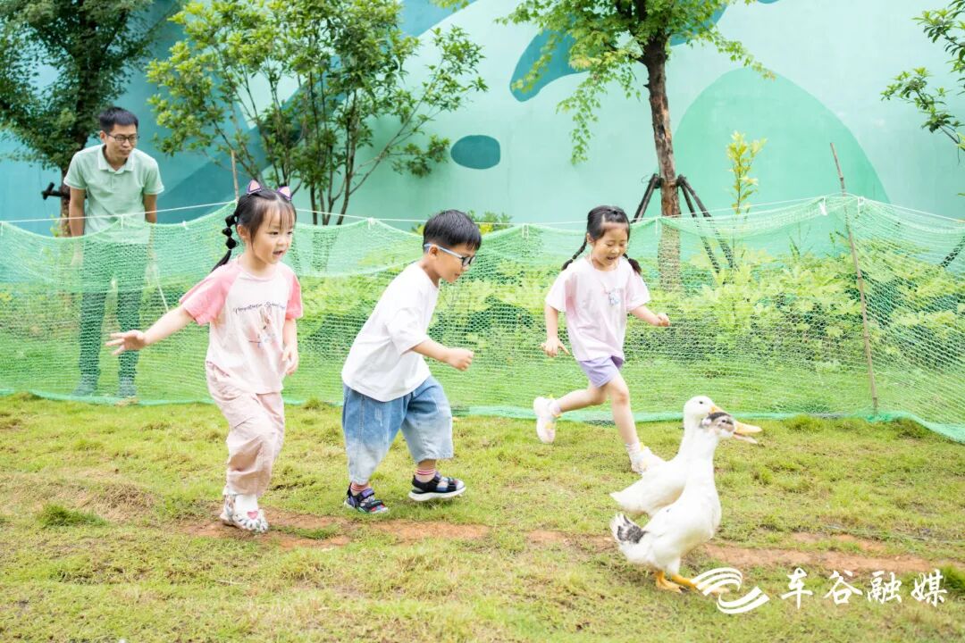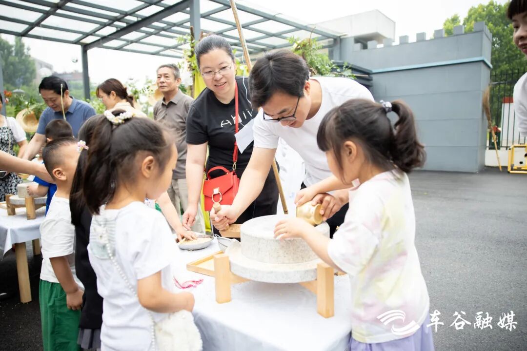 活动现场,孩子们光着脚在水里抓鱼、在泥地里奔跑抓鸭子、用自己亲手制作的杆子钓龙虾、腌制咸鸭蛋、用稻草扎成不同造型的稻草人,家长和孩子一起拉起手跳劳动号子、体验磨麦子,欢声笑语充满了整个操场。