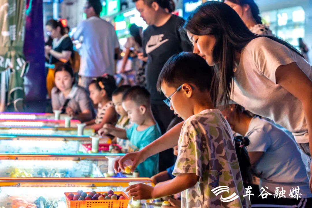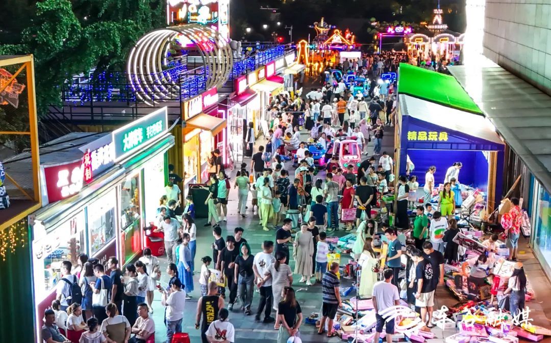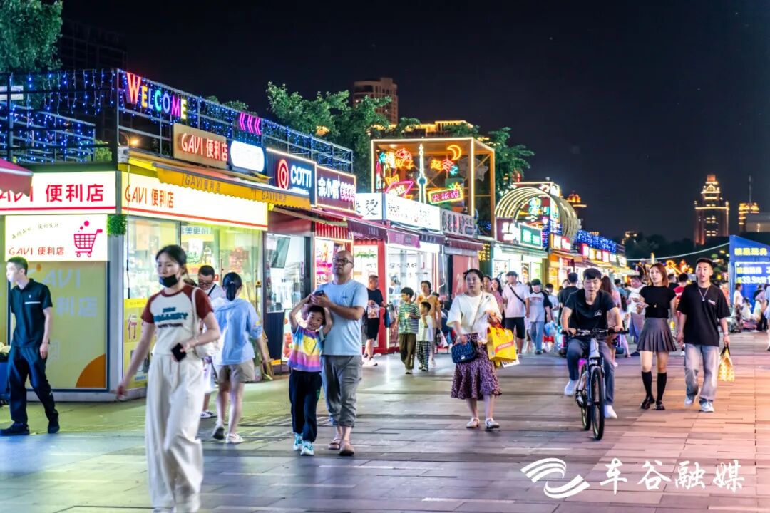 网红集装箱市集上,一手拿烤串、一手拿奶茶,一边跟着三五好友散步聊天是市民们的标配。广场上,童车从身边缓缓驶过,变幻的彩灯中总能看到家长与孩子的笑脸。儿童乐园里,旋转木马、小火车、儿童蹦床、网红秋千是孩子们的“首选”。万达金街上,三三两两的市民停下脚步,望着闪烁的霓虹灯,说:“走,进去搞个宵夜。”