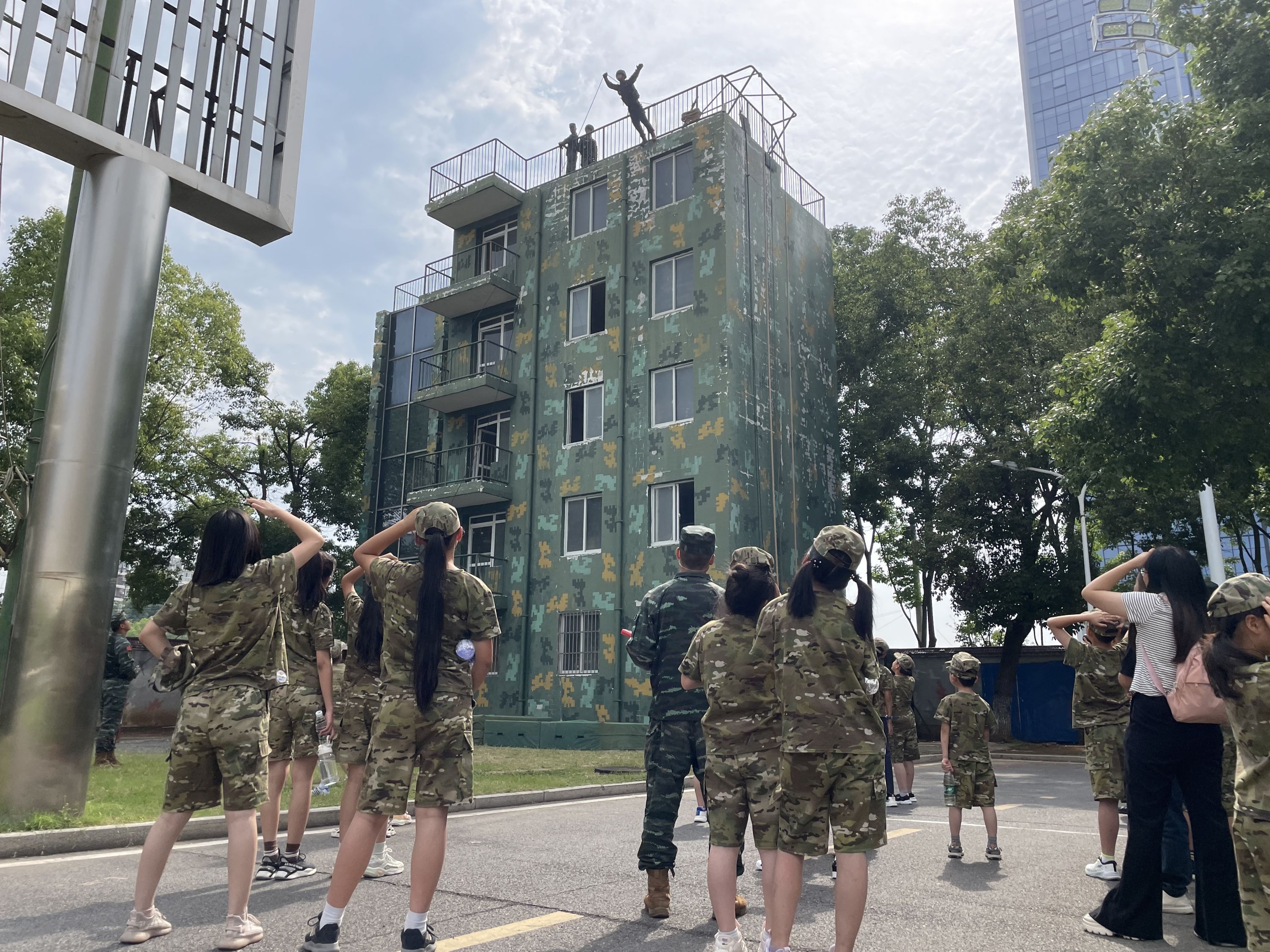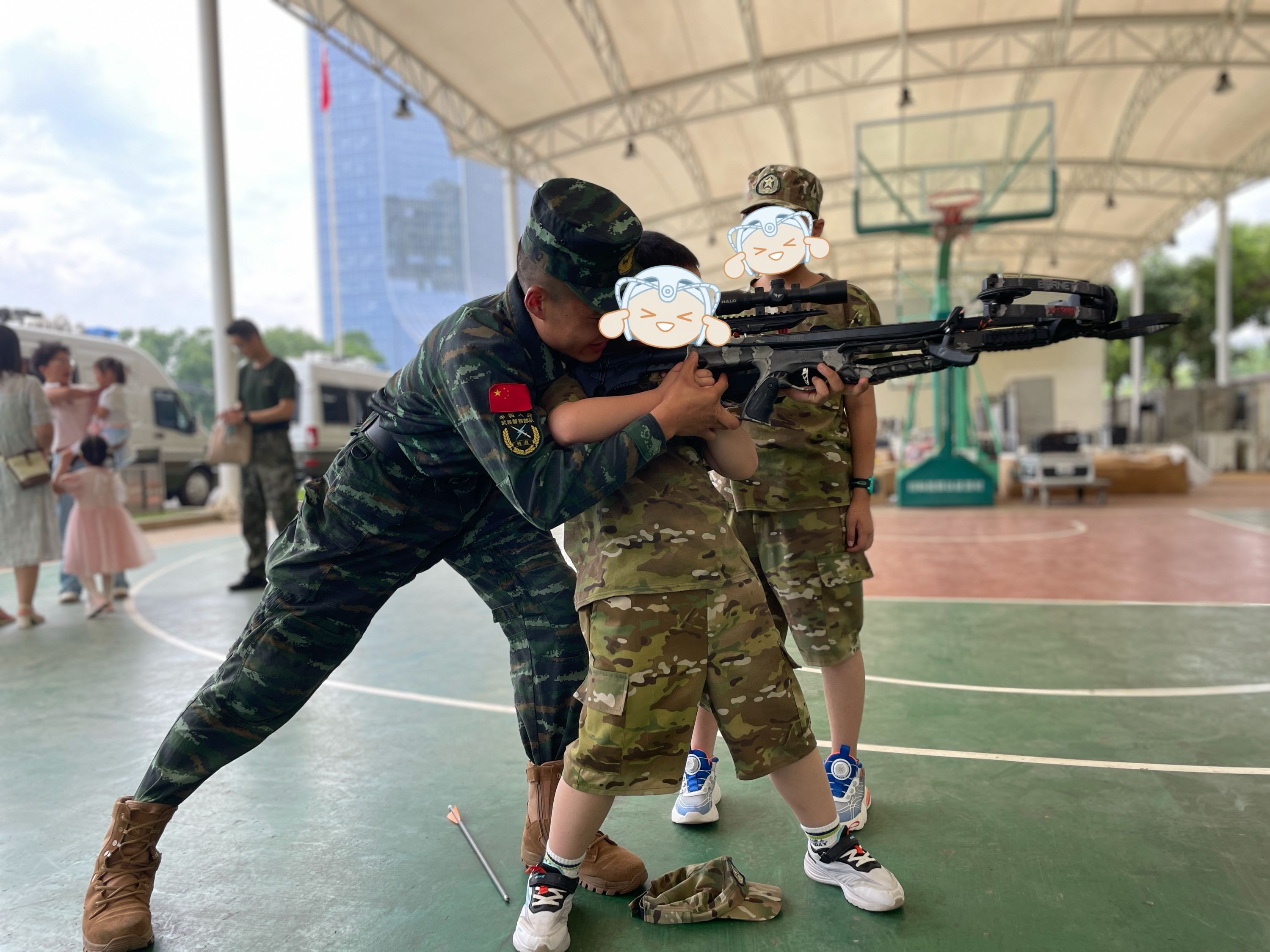 “一,二,三,四……”震耳欲聋的呼号声拉开了军事表演的序幕。接着,讲解员带领孩子们观看了高空速降、负重训练、攀绳训练等一系列武警常规训练项目,鼓励孩子们积极参与体验。