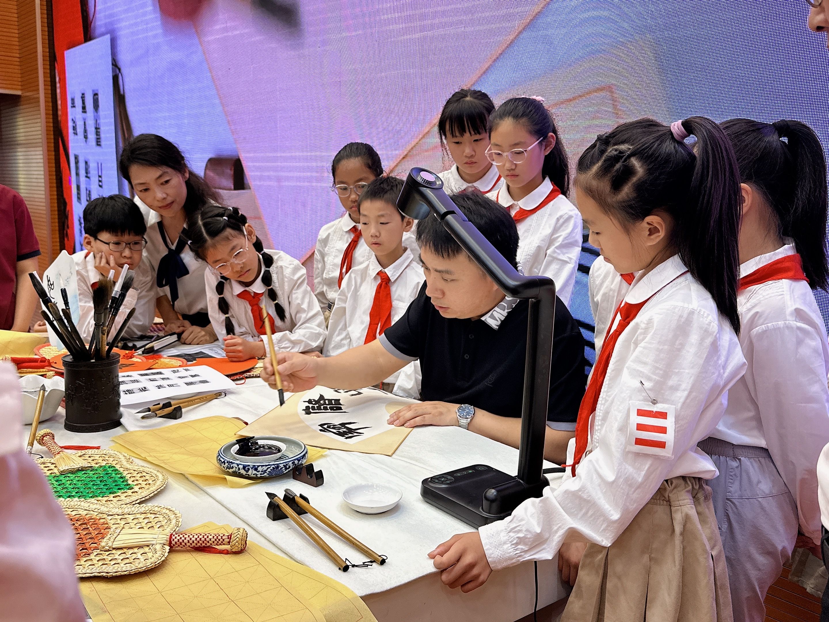 在书法家的指导下,师生现场挥毫,在扇面上创作书法,让墨香遇见夏日清凉。