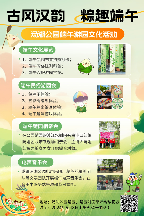 车谷融媒6月7日讯 为传承和弘扬中华优秀传统文化,丰富市民的精神文化生活,6月8日上午9:30—11:30,汤湖公园将在楚园和绣球花坡举办“古风汉韵 粽趣端午”端午游园会,邀请广大市民游客活动当天穿汉服到汤湖公园来游玩打卡,参与现场活动,体验端午节的传统习俗,感受传统文化的魅力。