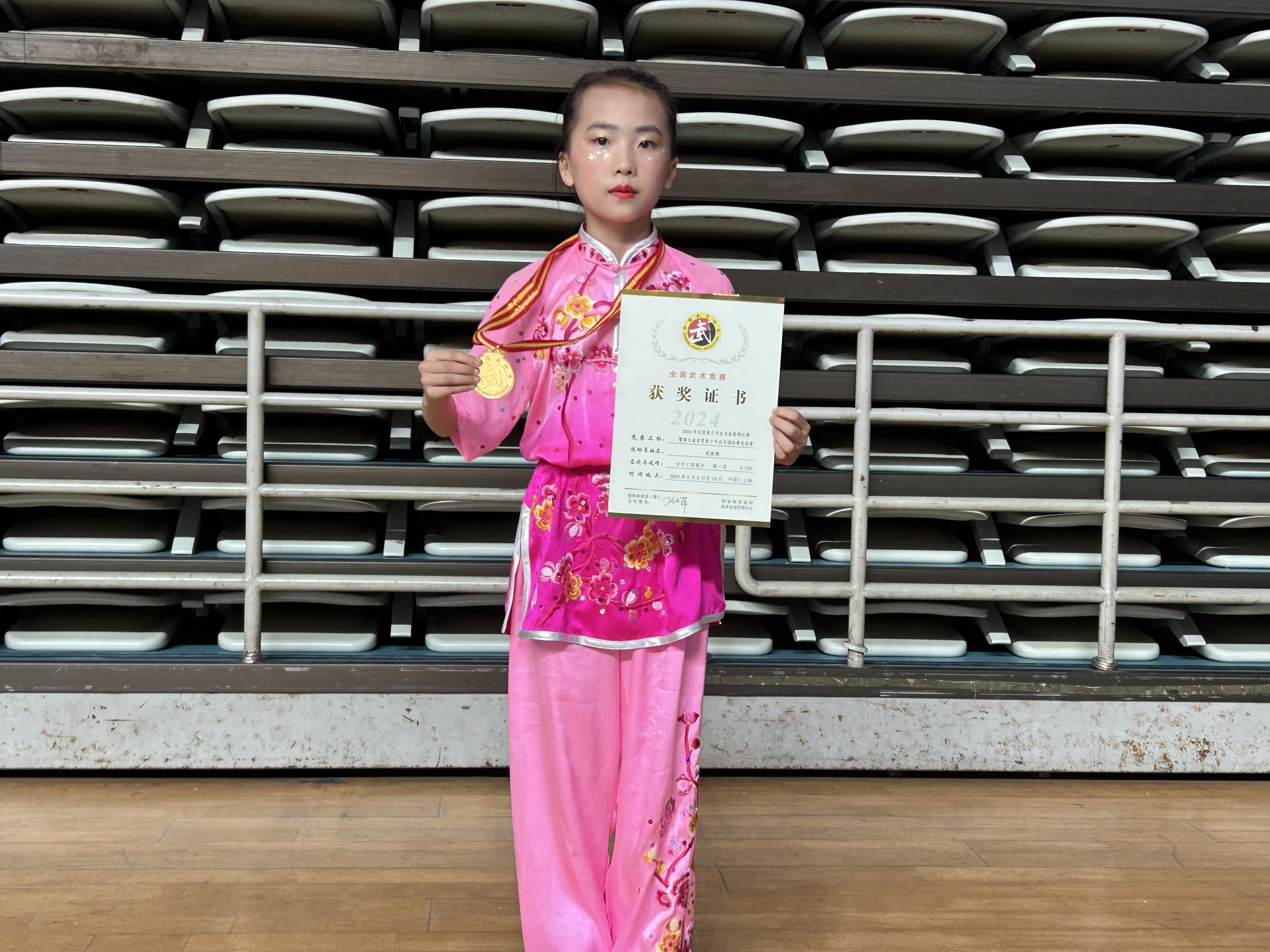周美穗是经开区洪山小学四年级三班学生,7岁开始练习武术,至今已有4年,2022年输送至湖北省队。教练员石海祥说,周美穗同学天赋高、能吃苦、训练踏实,学习成绩优异,2020年进入区武术队后天赋迅速凸显,先后在武汉市、湖北省各类比赛中摘获奖,为经开区争夺荣誉。