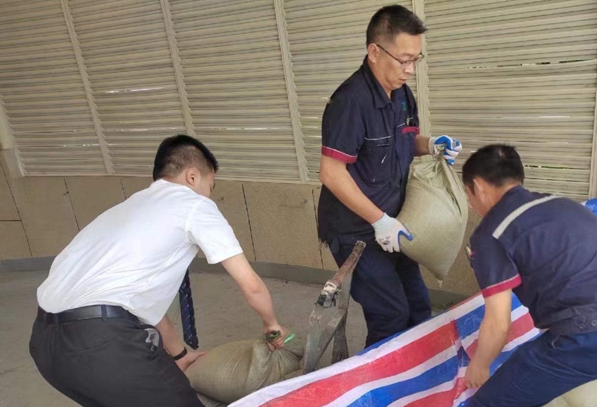 演练中,队员们在社区防汛抢险指挥员的统一调度下迅速行动。每三人一组,分工明确。两人负责搬运沙袋至防汛挡板处,一人负责摆放。沙袋的堆砌严格按照规定进行,确保防水、阻水效果最佳;另一组队员则检查排水设施、确保设施完好后迅速启动水泵排水。同时,队员们还密切关注积水情况,及时调整排水方案。