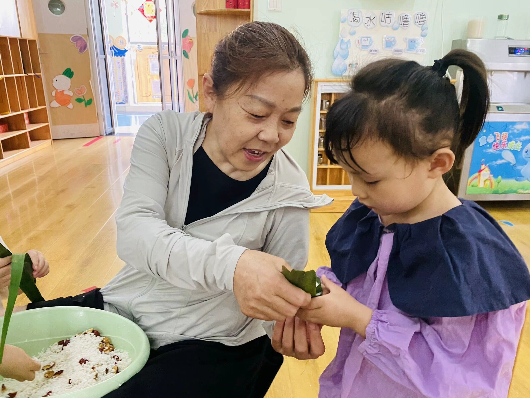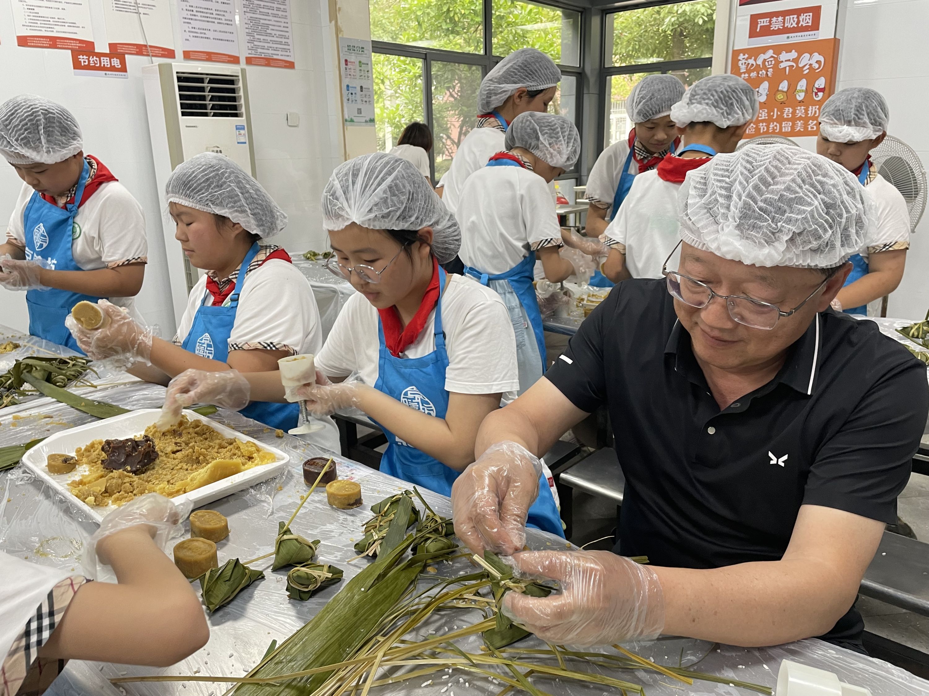 官士墩幼儿园、晨曦幼儿园、蒲潭幼儿园、薛峰小学邀请包粽子能手向学生们讲解演示包粽子的过程。学生们一起折粽叶、扎绳子等,一步步完成了自己的粽子。
