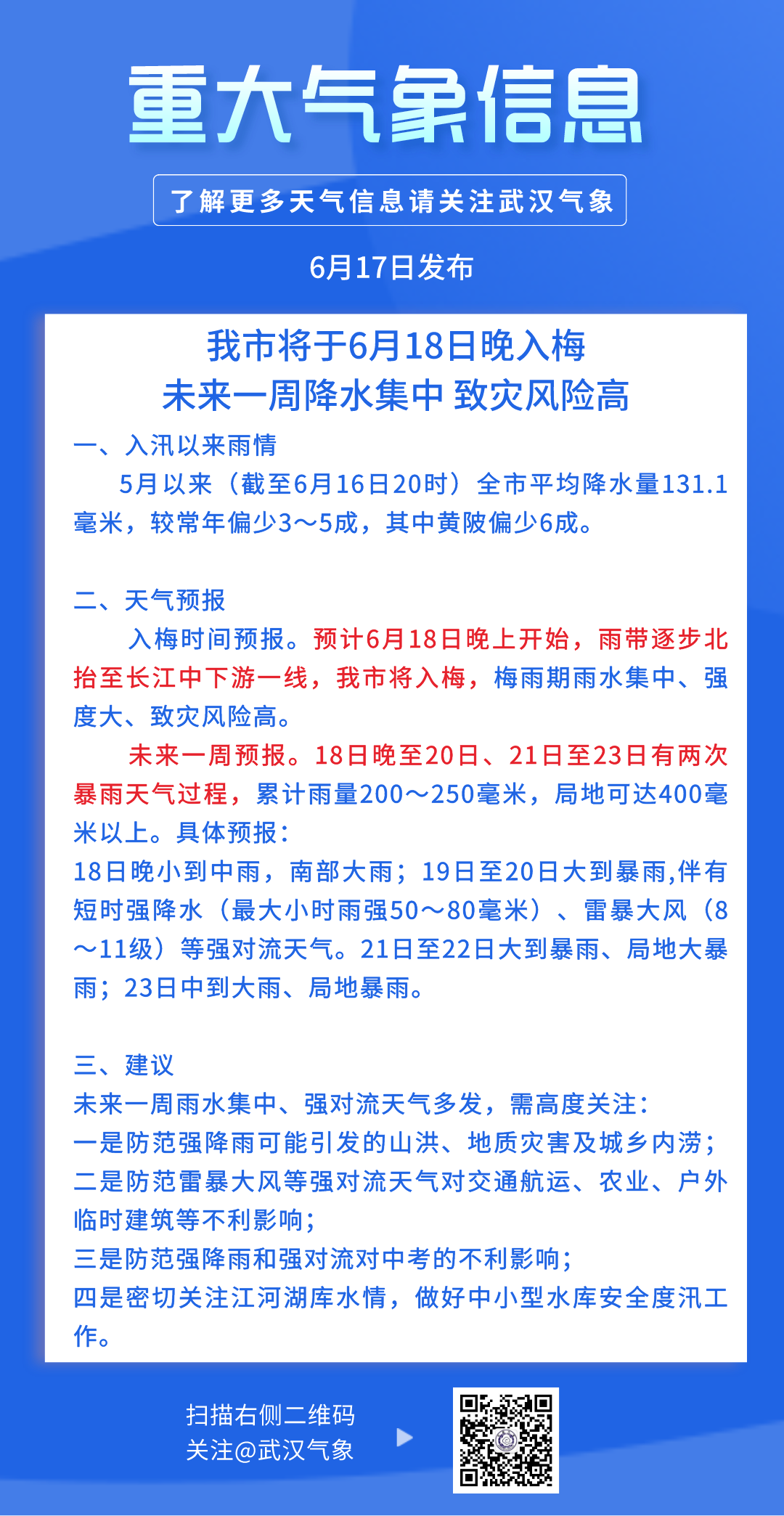 预计6月18日晚上开始,雨带逐步北抬至长江中下游一线,我市将入梅,18日晚至23日有一段降水集中期,降水强度大,致灾风险高。