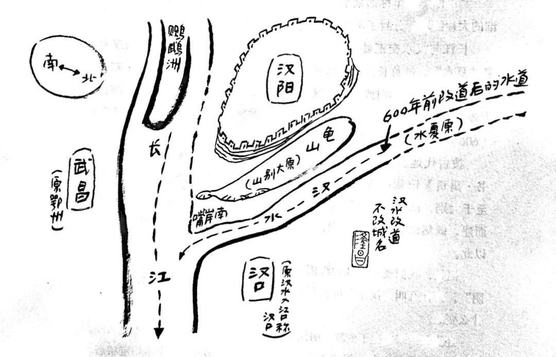 《禹贡》云:“嶓冢导漾,东流为汉;又东,为沧浪之水;过三澨,至于大别,南入于江。”汉水东流,到龟山(原名“大别山”)后向南汇入长江,山南水北为阳,故有“汉阳”。但至明代成化后,汉水下游因连年洪水汹涌,冲刷辟出新道改至汉阳城北,故《嘉靖汉阳府志》中有说:“汉水,在县治东北三里,大别山北。”