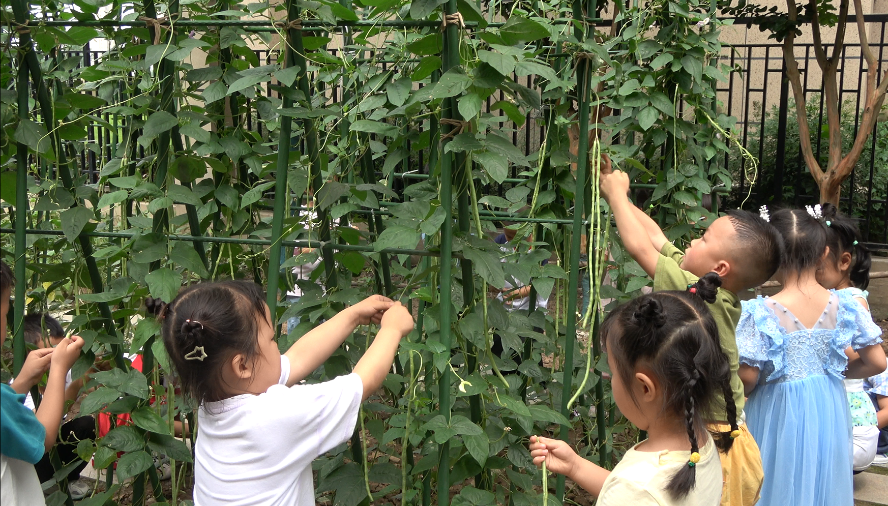 藤架上,灵活的长豆角宛如顽皮的孩童,有的直垂向下,有的歪着身体,模样可爱。孩子们在菜地间穿梭,有的用篮子搬运,有的用手摘下,有的高喊:“我找到了一个豆角之王!”提着篮子回来时,一个孩子兴奋地说:“我们丰收了!”