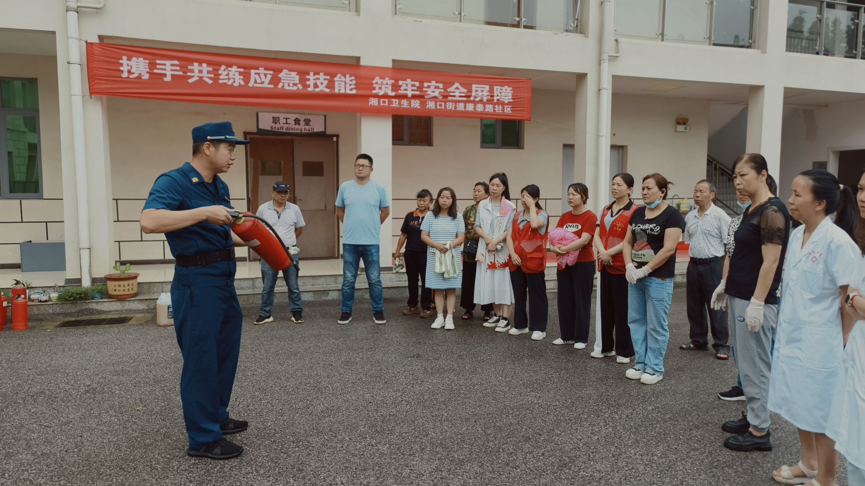 演练结束后,湘口专职消防队的队员对如何正确使用灭火器进行了现场演示,并指导社区居民及卫生院职工进行实际操作。演练活动总指挥对此次活动进行了总结,要求全体人员以此次培训和演练为契机,不断提高安全防范能力,共建平安社区。