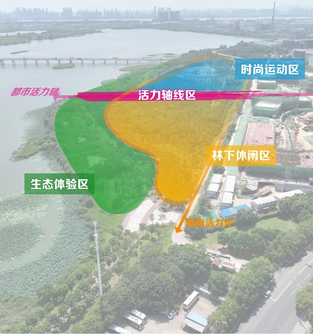 公园分为活力轴线区、时尚运动区、生态体验区、林下休闲区和慢跑活力环。