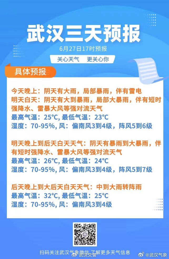 根据气象部门预计,未来几天武汉市有强降雨天气。27日晚至29日,全市迎来新一轮大到暴雨天气过程,并伴有短时强降水,雷暴大风等强对流天气。30日-7月3日我市还将有较明显降水。武汉交警在此提醒,请广大市民密切关注天气情况,合理规划行程,注意交通安全。