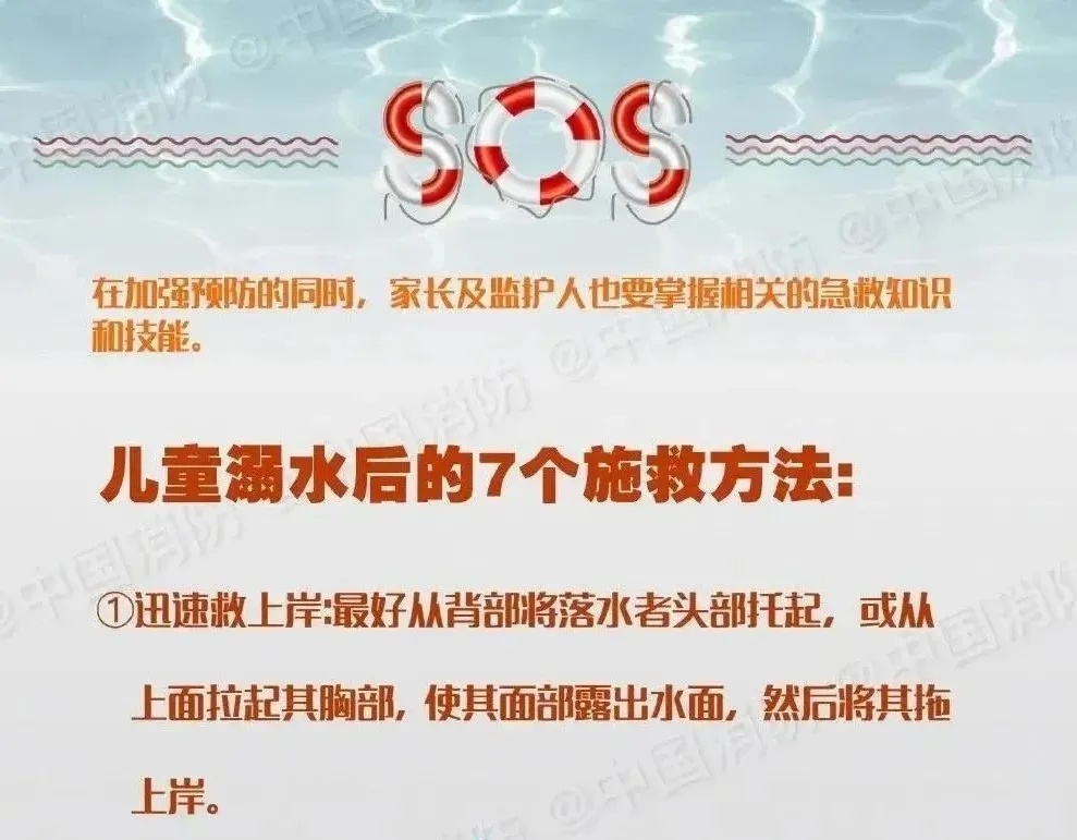 首先要明确“争分夺秒”原则,因为溺水后的黄金营救时间只有3~4分钟,4分钟之后,孩子每多一分钟的窒息时间,死亡率就会增加10%。哪怕最终得救了,也容易出现后遗症。