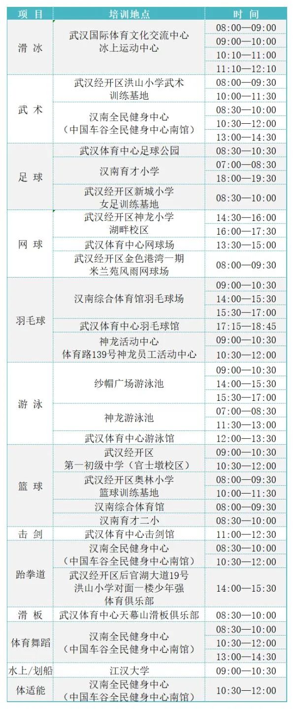 2024年7月27日—8月7日(共12天,冰雪项目为8天,部分项目培训时间有所调整),详情可登录武汉市体育局官网或“武汉智慧体育服务平台”官方微信公众号查询。