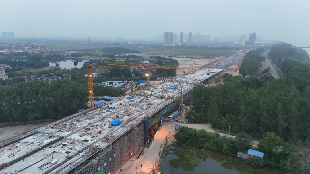 大军山跨线桥属于左岸大道大军山段,全长717m,主桥跨径90m,上跨檀军公路、鄂江左岸大堤,采用大节段现浇法施工。因项目毗邻长江,地质条件异常复杂,同时,施工期间经历梅雨季节,降水量大、极端天气多,给施工带来了诸多挑战。