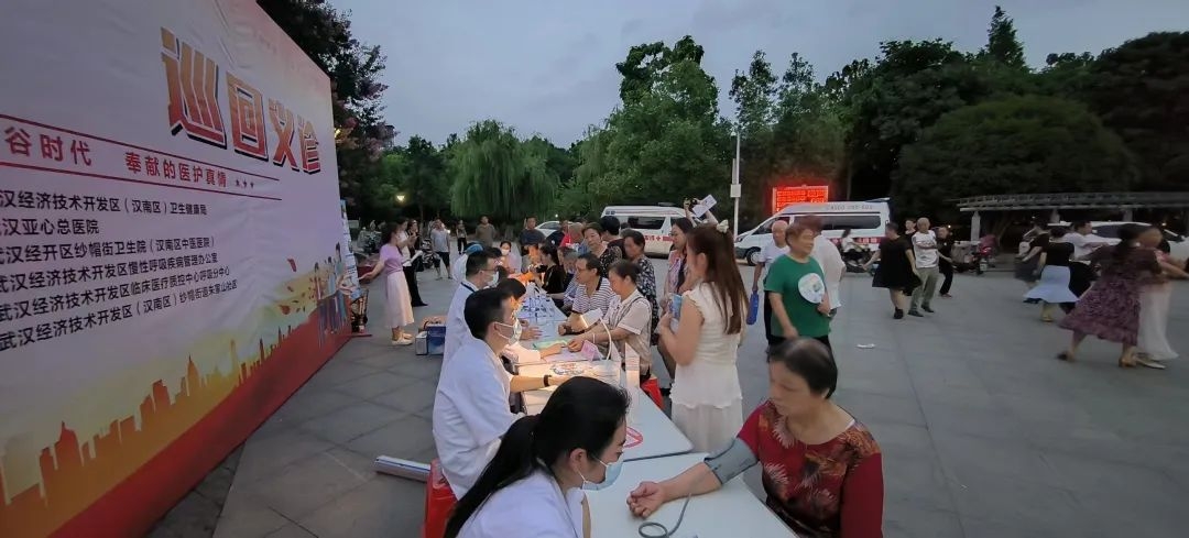 近日,在武汉经开区卫健局指导下,武汉亚心总医院、武汉经开区纱帽街卫生院(区中医医院)联合朱家山社区在纱帽街绿化广场开展“清凉一夏,巡回义诊”送健康活动,共计为300余位居民提供健康服务。