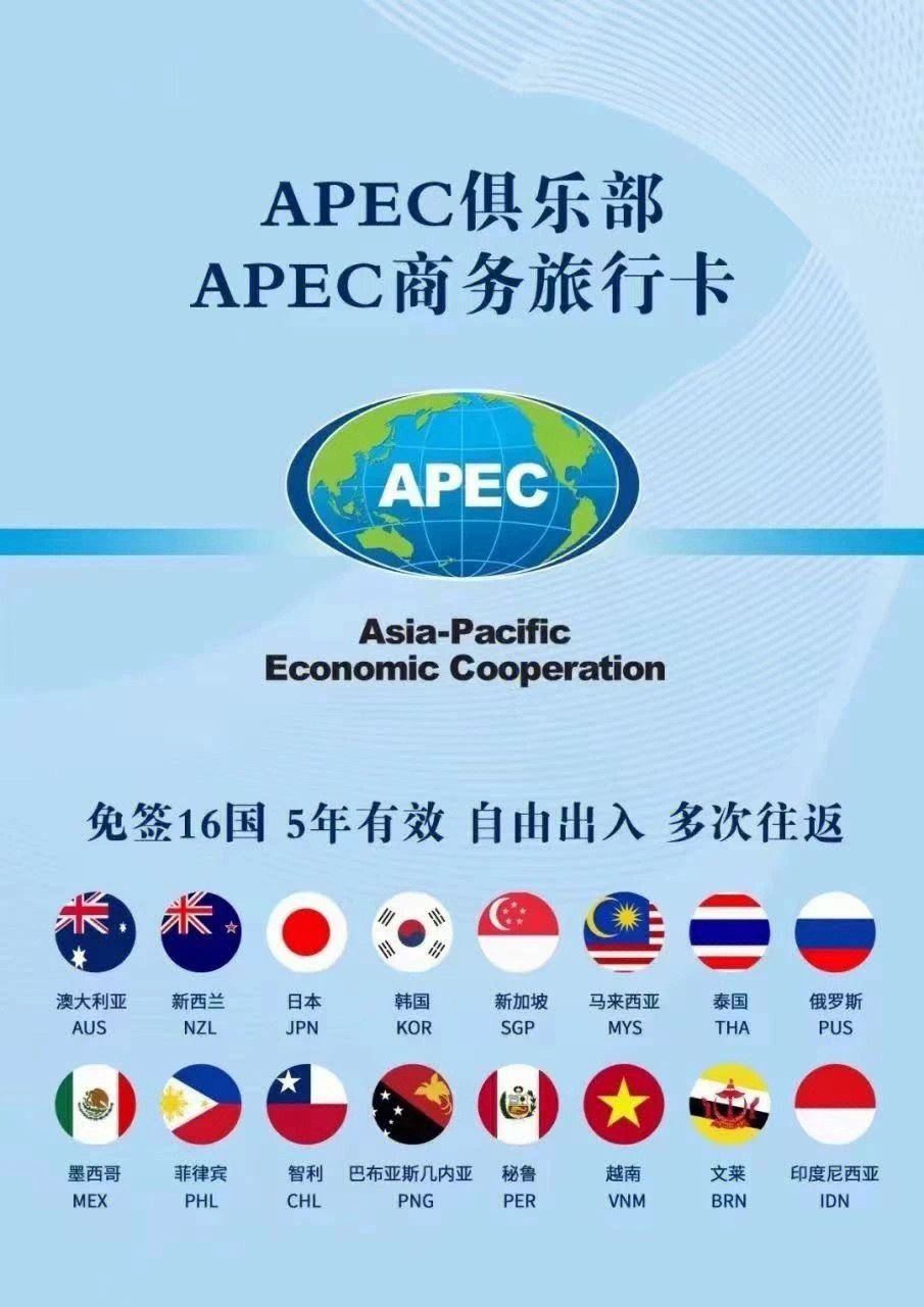 APEC商务旅行卡被称作“民间外交护照”,是亚太经合组织为便利区域商务人员往来创立的特殊旅行证件。持卡人凭本人有效护照和APEC商务旅行卡,可自由往来包括中国、日本、韩国、马来西亚、印尼、文莱、菲律宾、新加坡、泰国、越南、澳大利亚、新西兰、巴布亚新几内亚、智利、秘鲁、墨西哥和俄罗斯在内的17个APEC经济体,单次入境停留时间从60天至180天不等,在5年内无须办理入境签证手续。