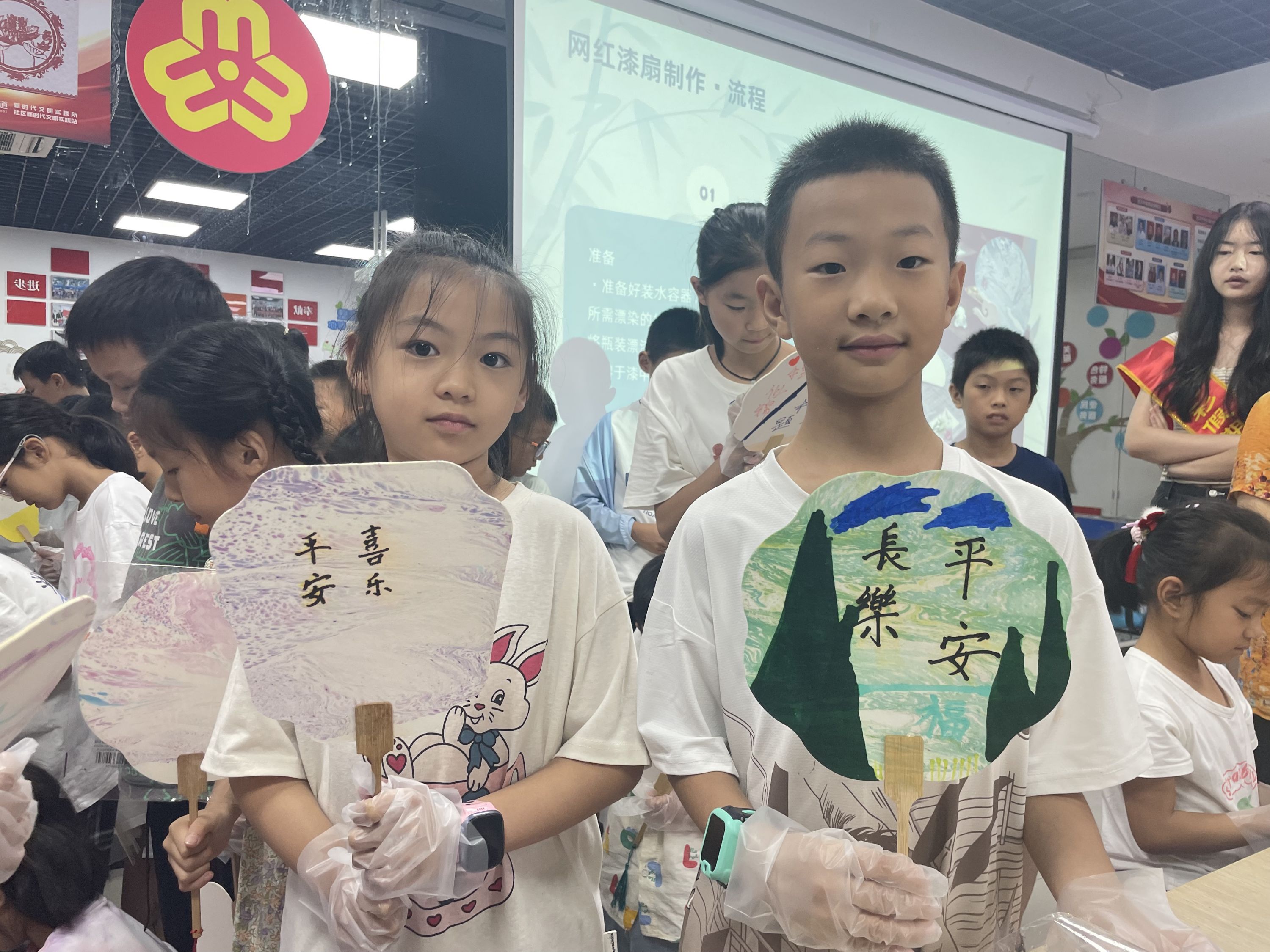 在非遗文化体验活动中,漆扇制作体验环节成了全场瞩目的焦点。孩子们在专业老师的指导下分组进行操作,用画笔在扇面上绘制充满创意的图案。