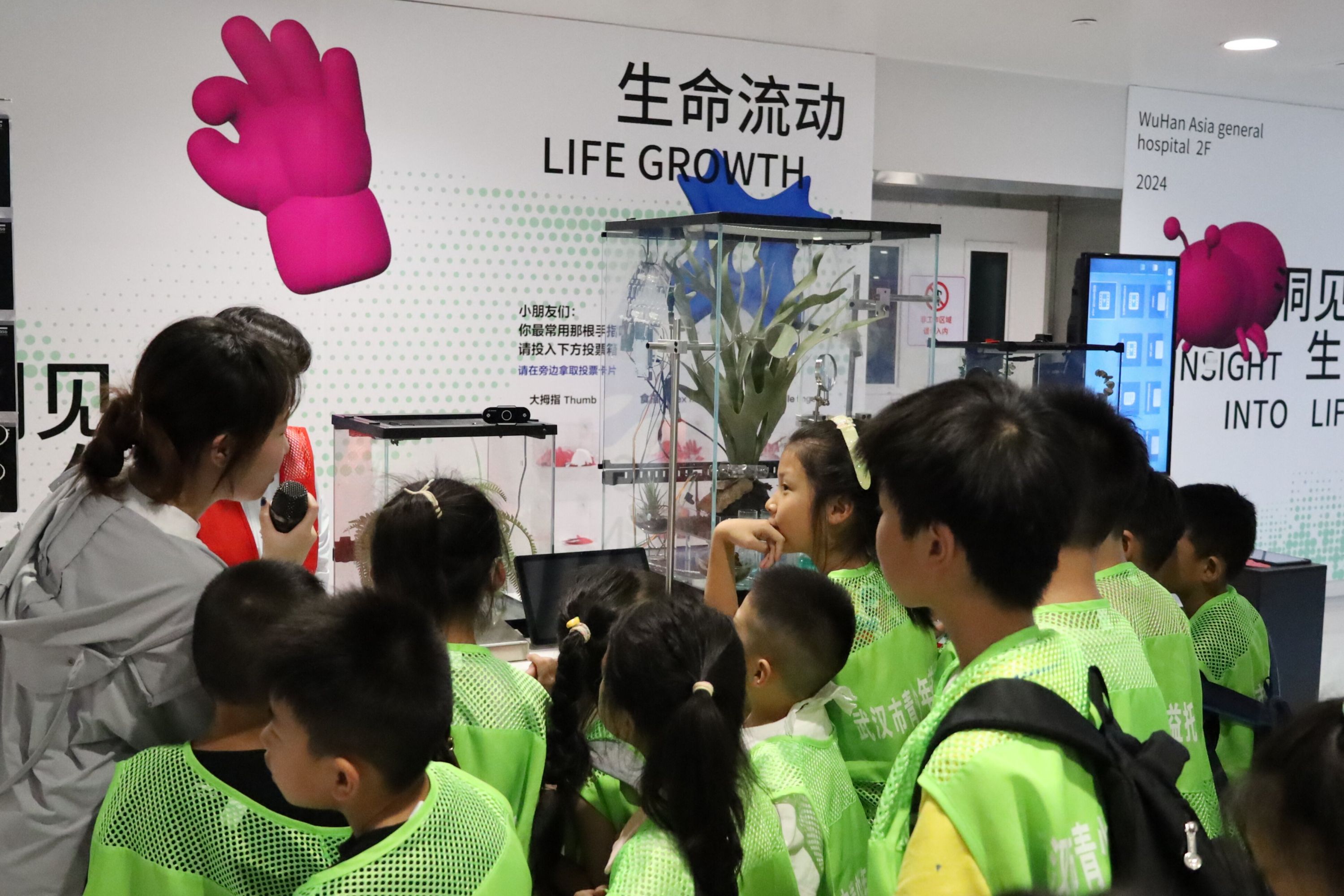 在“洞见生命”艺术展厅,一幅幅神奇的投影、一个个新奇的实验装置让小朋友们产生了浓厚兴趣。讲解员带领大家观察了鱼类、植物等生物标本,以及动物组织与人类躯体的协同创作投影,一个个生命共同体带给小朋友们视觉和心灵的撞击,启发着他们对生命和身体的初步思考。