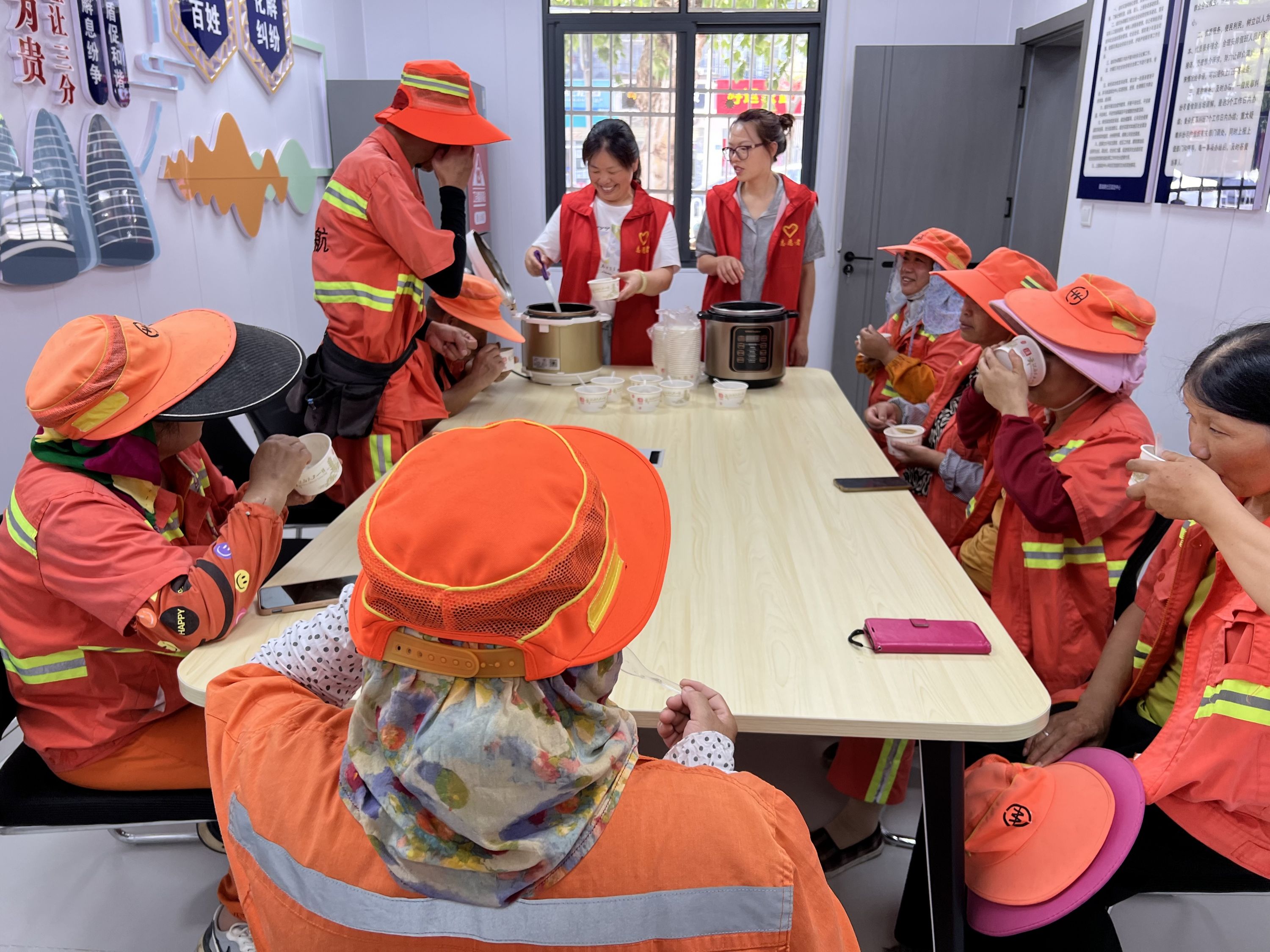 工作了一早上的周阿姨说:“天气炎热,喝多少水都不管用,还是绿豆汤喝着舒服。”大家听后露出开心的笑容。