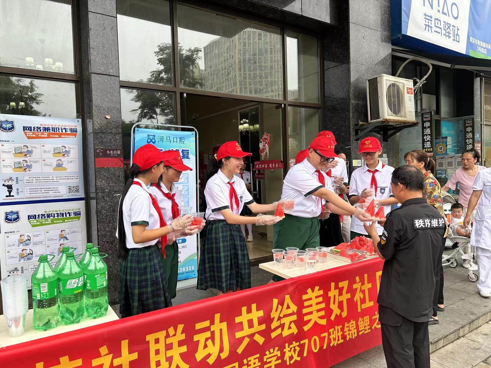 来自武汉经开外国语学校707班锦鲤之家的学生志愿者们,趁着暑假来社区为居民们开展志愿服务,有的负责便民服务摊位活动号码牌的发放,有的负责现场秩序维护,有的在小区门店向来往居民发放宣传单进行防诈骗宣传,还有的为来往的快递员、外卖员、保安保洁师傅送解暑西瓜及消暑用品。居民们纷纷为孩子们的公益服务点赞:“这群小志愿者忙前忙后的,很贴心!”